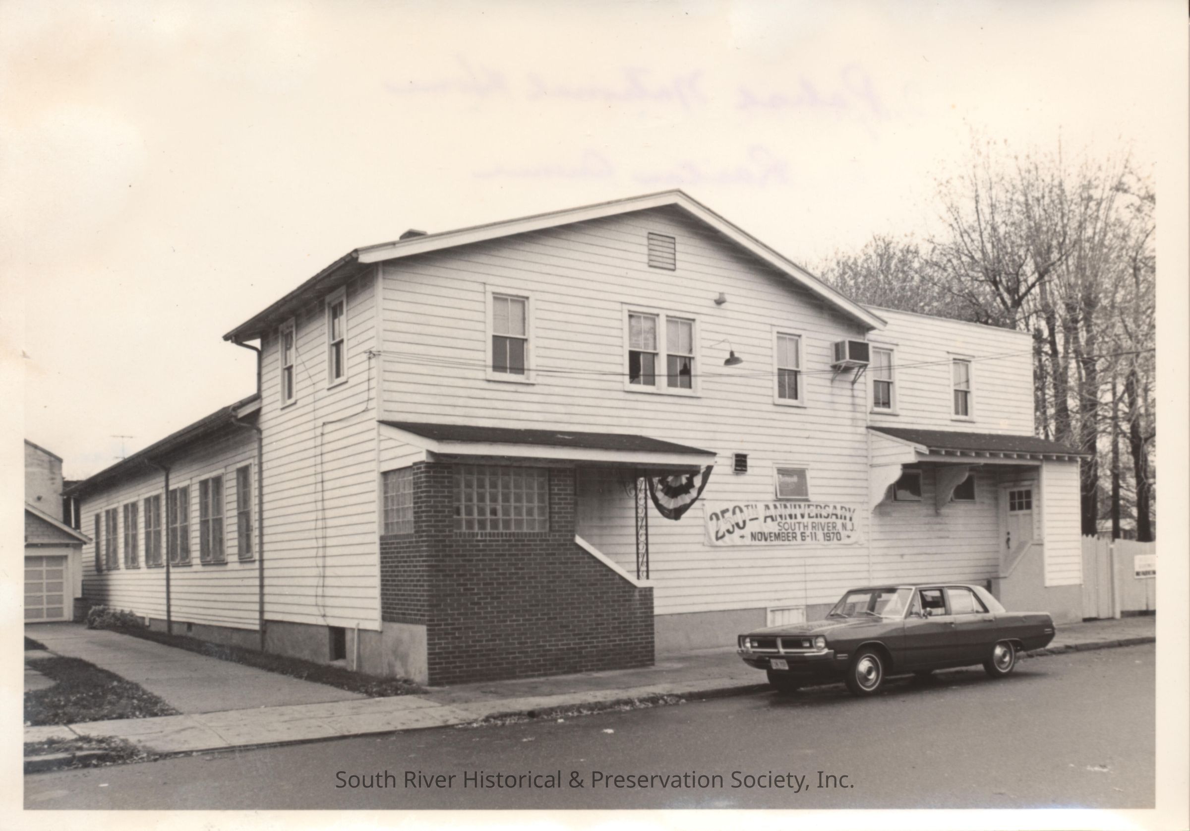 Photograph of the Polish National Home on Raritan Avenue. The banner on the front of the building reads "250th Anniversary, South River, N.J. - November 6-11, 1970." The view is of the Grochowiak Street side of the building.