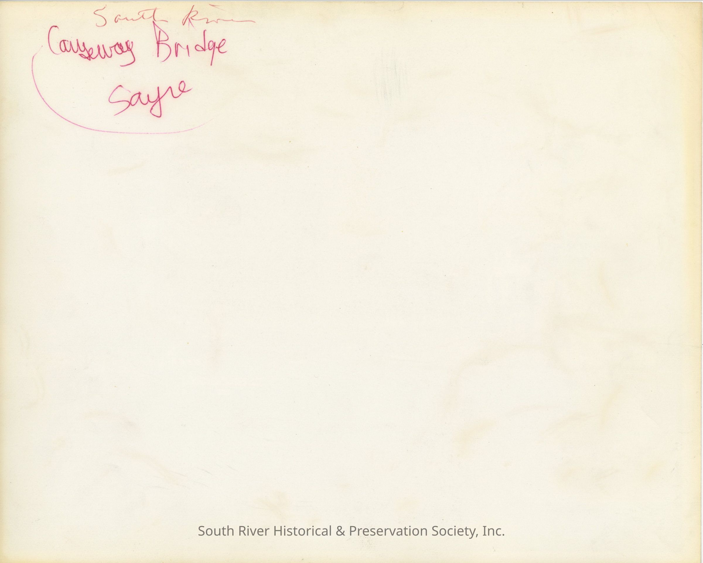 The back of the photograph has a handwritten note that reads, "South River, Causeway Bridge, Sayre."