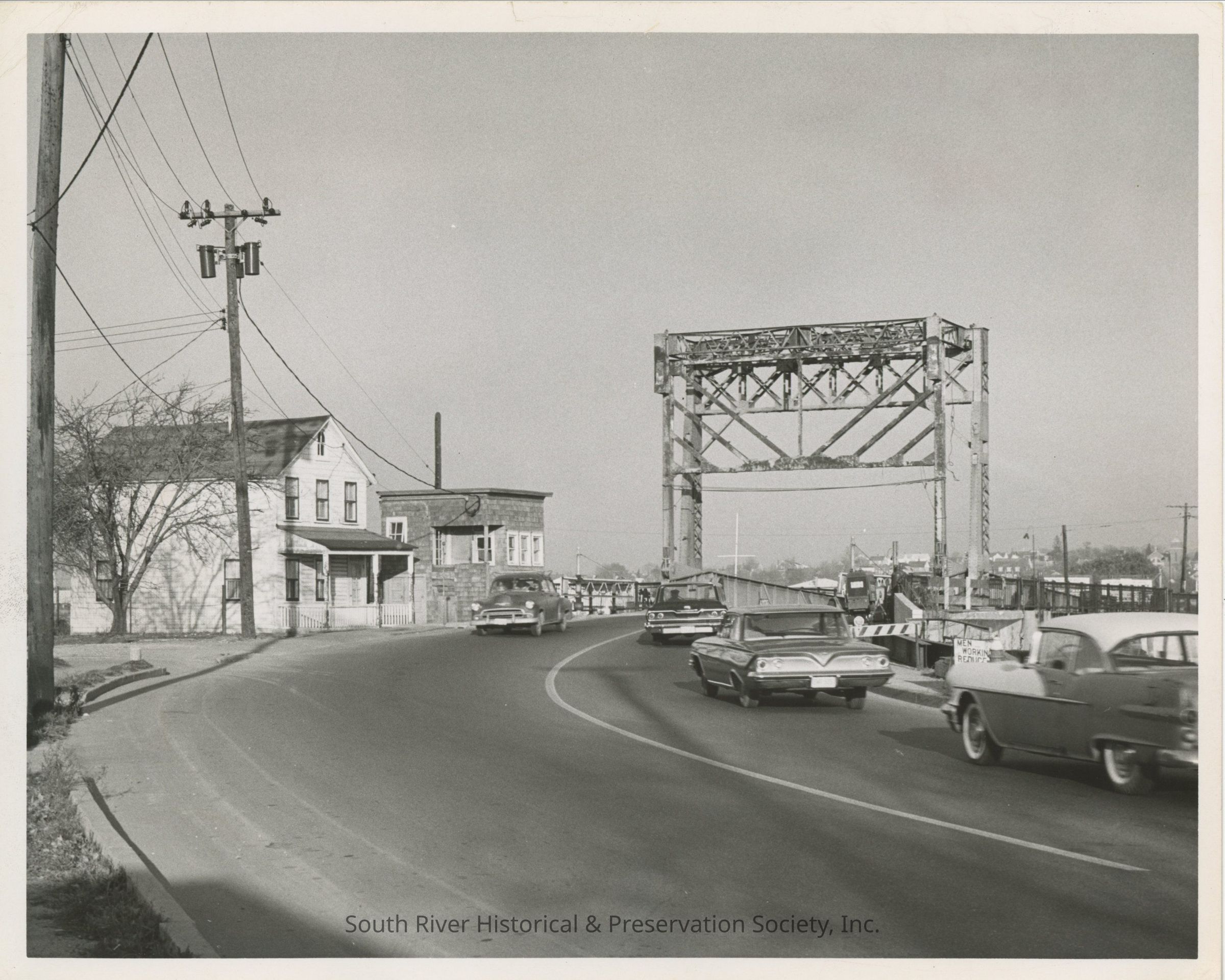 Black and white photograph of cars traveling across the Causeway bridge after it reopened following an October 1966 accident that damaged the lifting mechanism. The concrete counterweight is missing, its location shown by an empty steel frame. The view is from the South River side of the bridge looking towards Sayreville. A house and another small building are visible at the left.