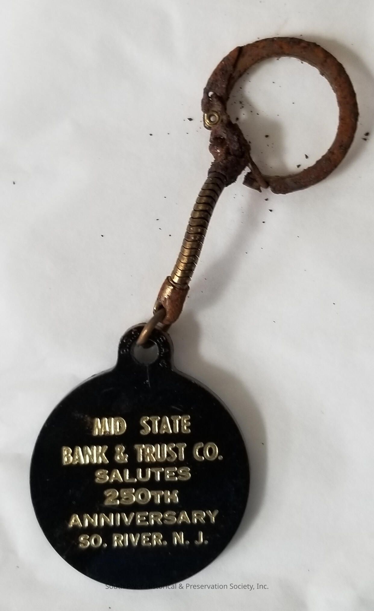 Keychain commemorating South River's 250th anniversary in 1970. The decorative portion of the keychain is round and imprinted "Mid State Bank and Trust Co. Salutes 250th Anniversary So. River. N.J." Made of black plastic with gold print and a goldtone chain. Chain is rusty.