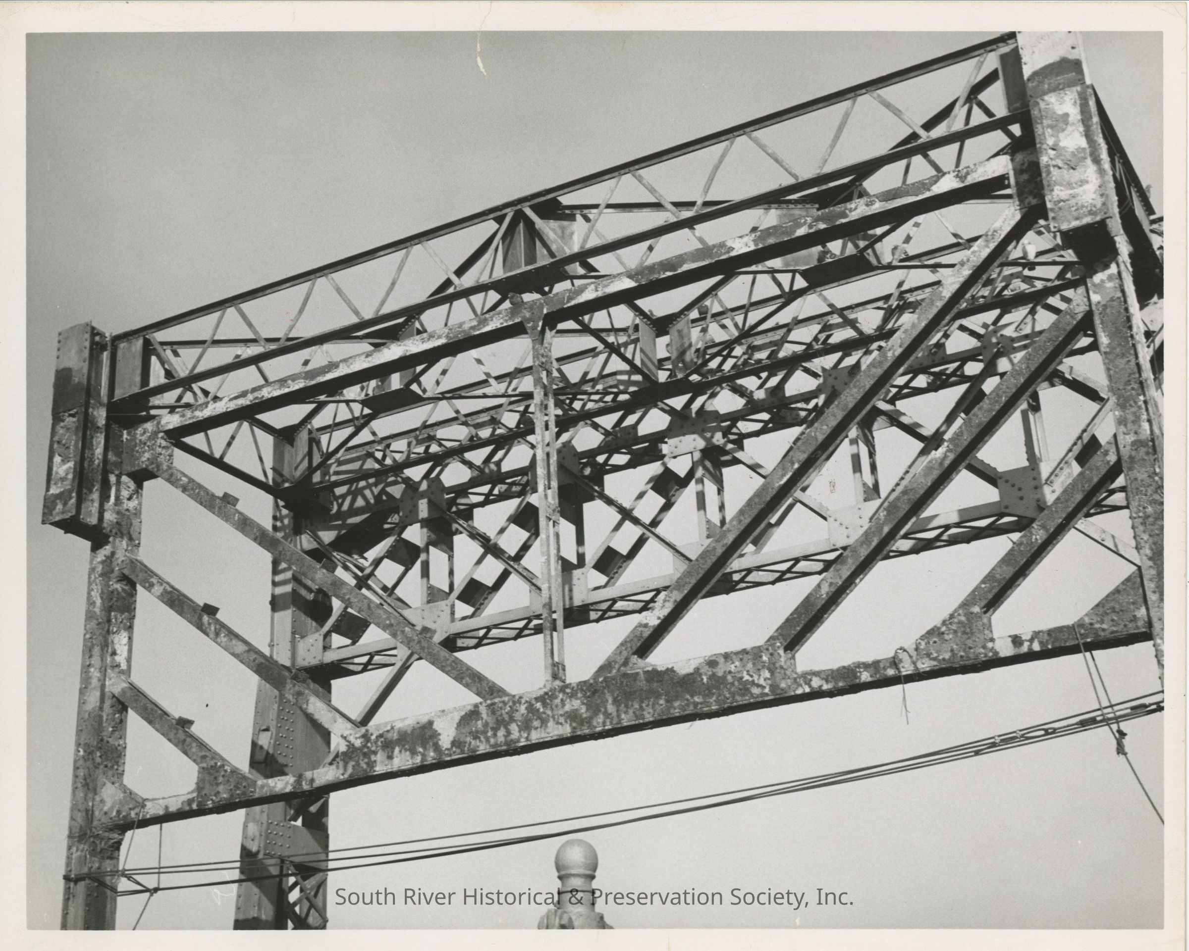 Black and white photograph of the steel frame that supported the concrete counterweight for the Causeway bridge before it was removed following an October 1966 accident that damaged the lifting mechanism. The view is from the South River side of the bridge looking towards Sayreville.