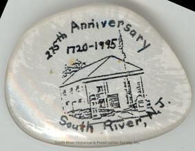 Commemorative pin made out an eyeglass lens. A small drawing of the South River Museum/Old School Baptist Church is surrounded by text, "275th Anniversary, 1720-1995" above and "South River, N.J." below.