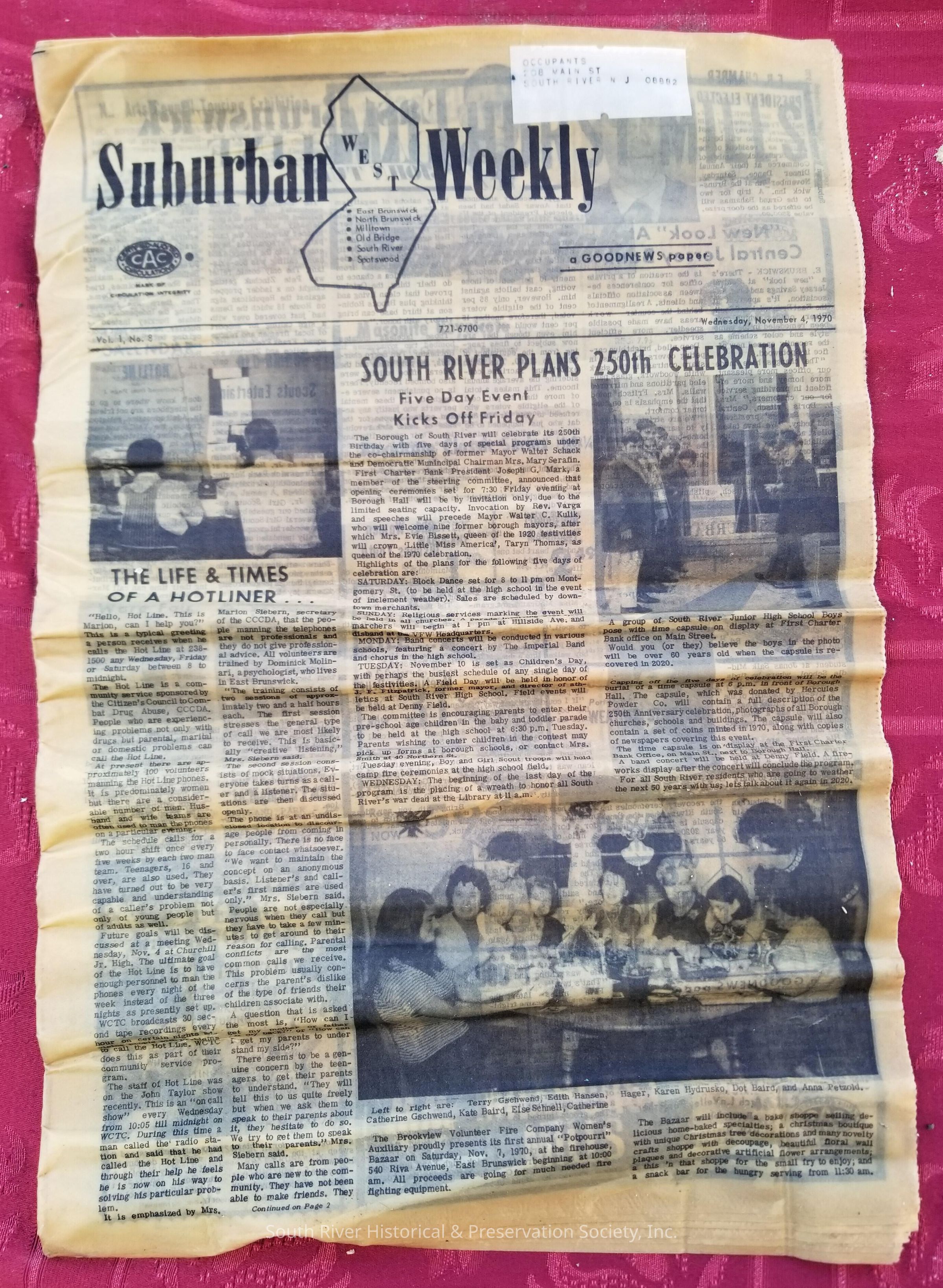November 4, 1970 issue of the Suburban Weekly. Two headlines read "South River Plans 250th Celebration: Five Day Event Kicks Off Friday" and "The Life & Times of a Hotliner". The photograph accompanying the article about the 250th anniversary shows a group of South River Junior High School boys posing in front of the time capsule displayed in the window of the First Charter National Bank office on Main Street.