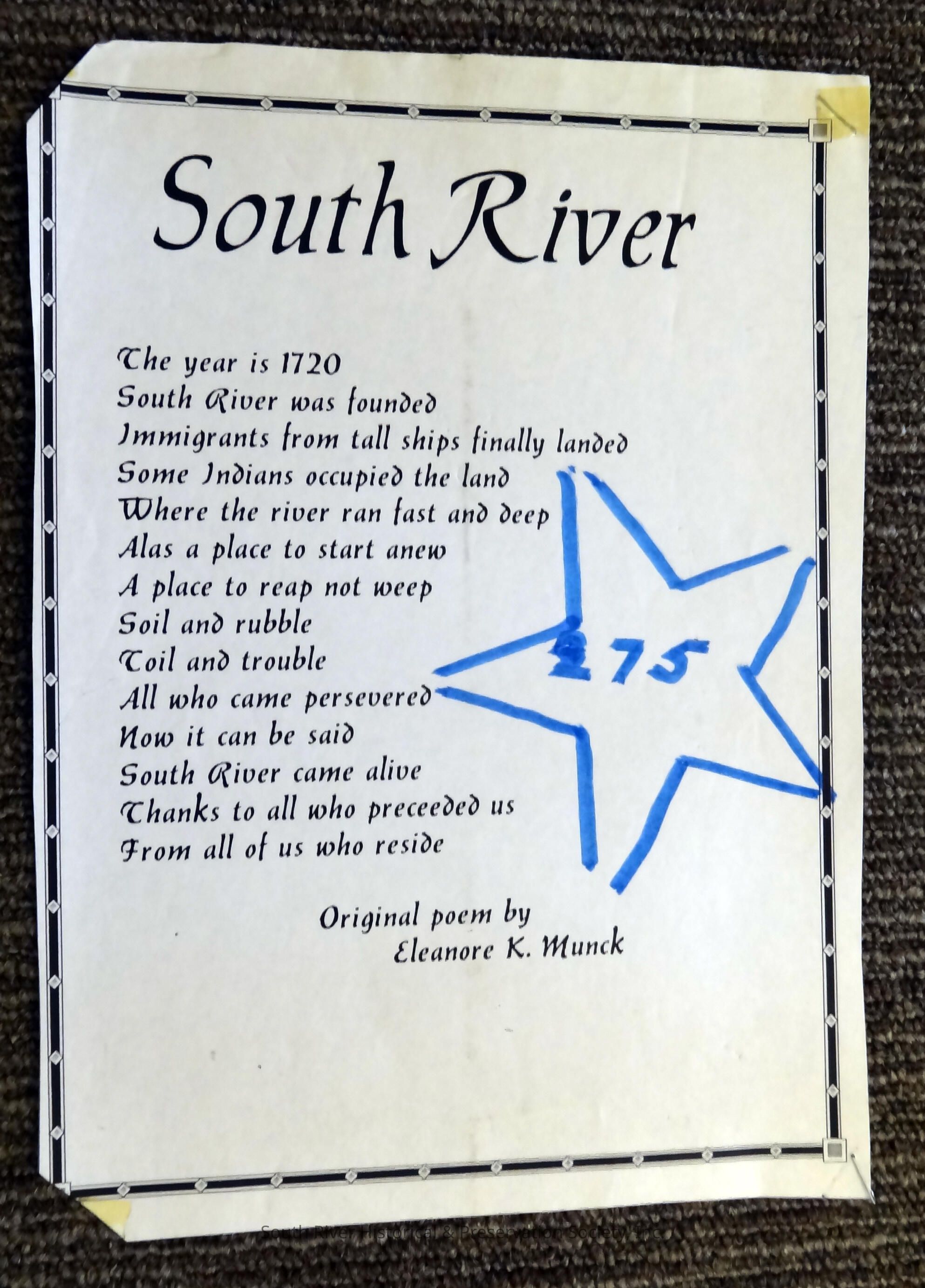 Poem is titled "South River" and reads as follows.
