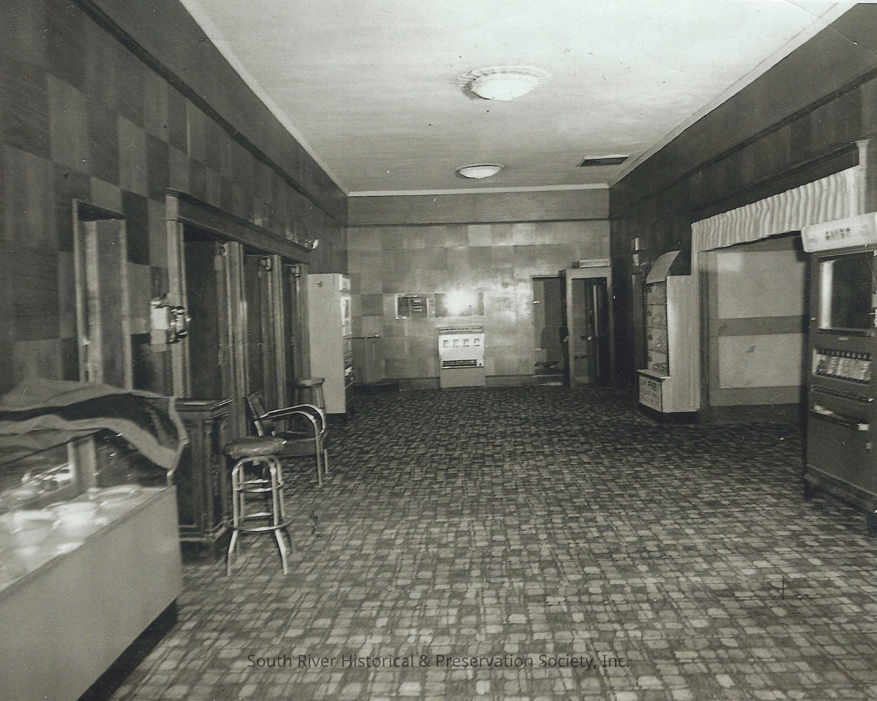 Digital copy of a black and white photograph of the main lobby of the Capitol Theatre on Main Street. The display case at the left and the case on the far side of the doorway at the right feature dishes and other items that were given away one evening each week. There are also three vending machines as well as a telephone booth in the far right corner. The doors to the left lead to the main entrance. The door to the right leads into the theater.