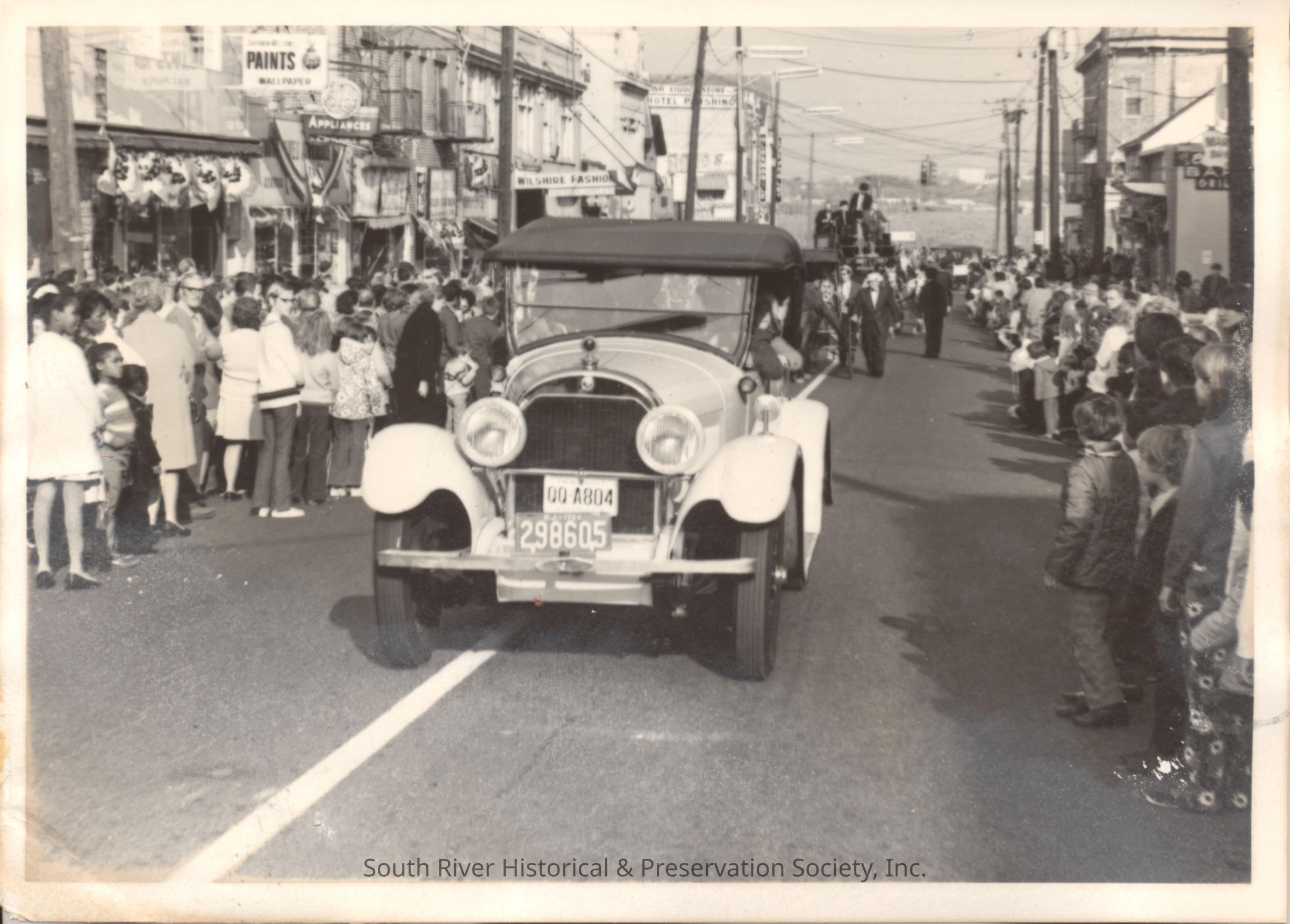 Photograph of an antique automobile in the parade held for the celebration of South River's 250th anniversary in 1970. The car has two license plates, one from 1924 and a modern plate identifying the car as an antique.