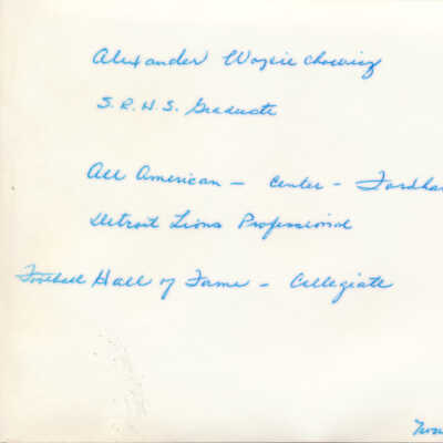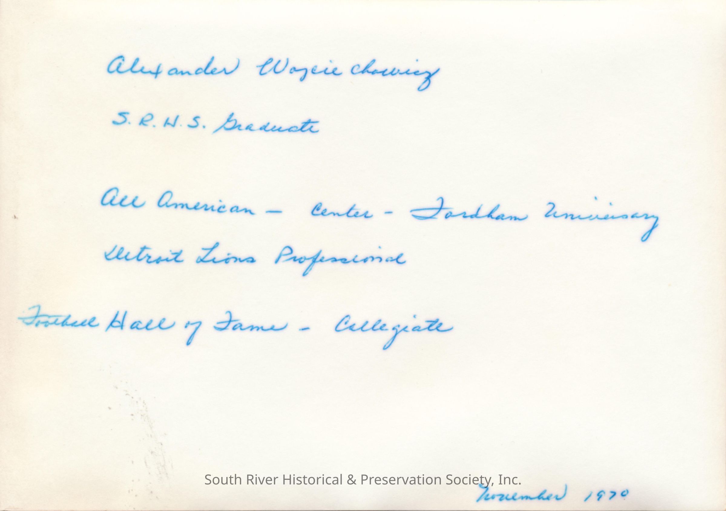 A note handwritten on the back in blue ink reads "Alexander Wojciechowicz, S.R.H.S. graduate; All American - Center - Fordham University; Detroit Lions Professional; Football Hall of Fame - Collegiate; November 1970."