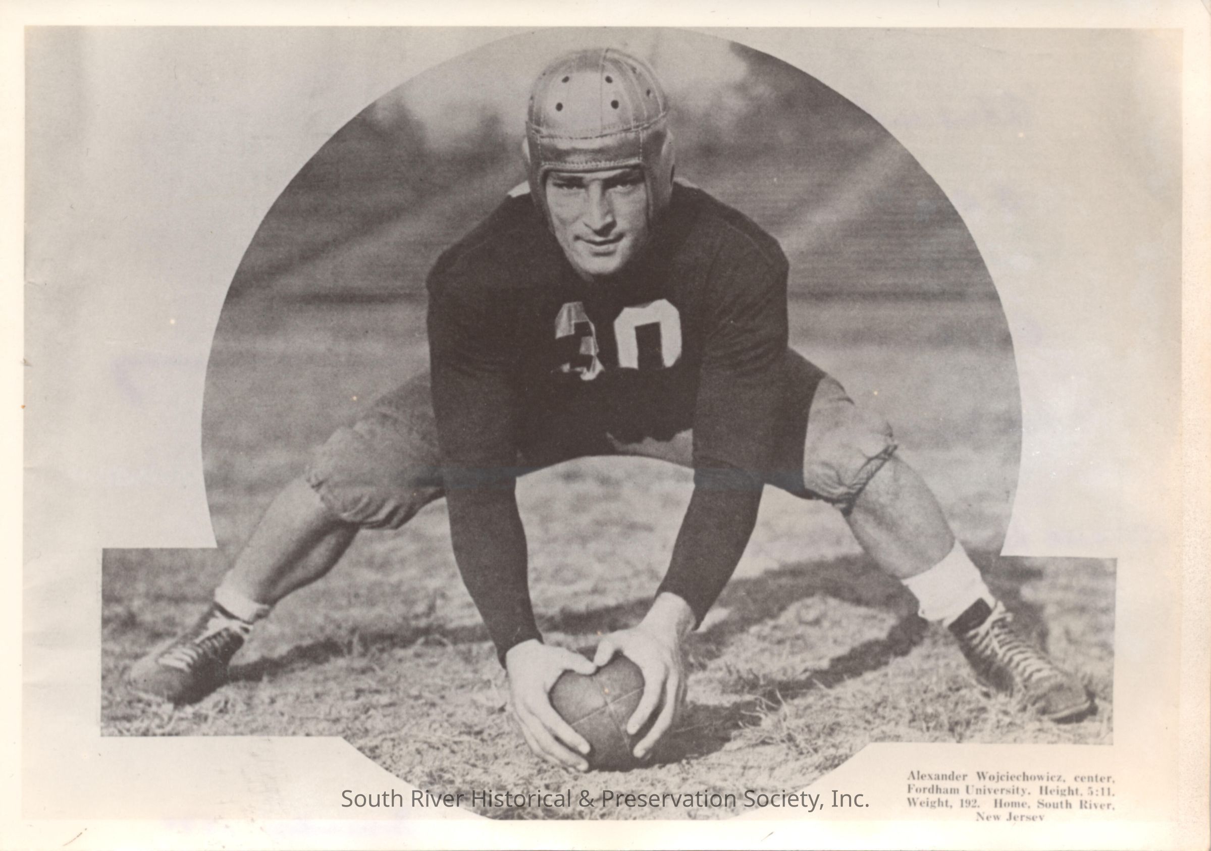 Photograph of a photograph of Alexander Wojciechowicz posed in his football uniform, number 30, ready to snap the ball. The related caption reads "Alexander Wojciechowicz, center, Fordham University. Height, 5:11. Weight, 192. Home, South River, New Jersey."