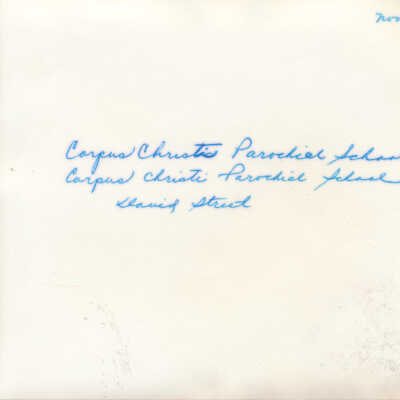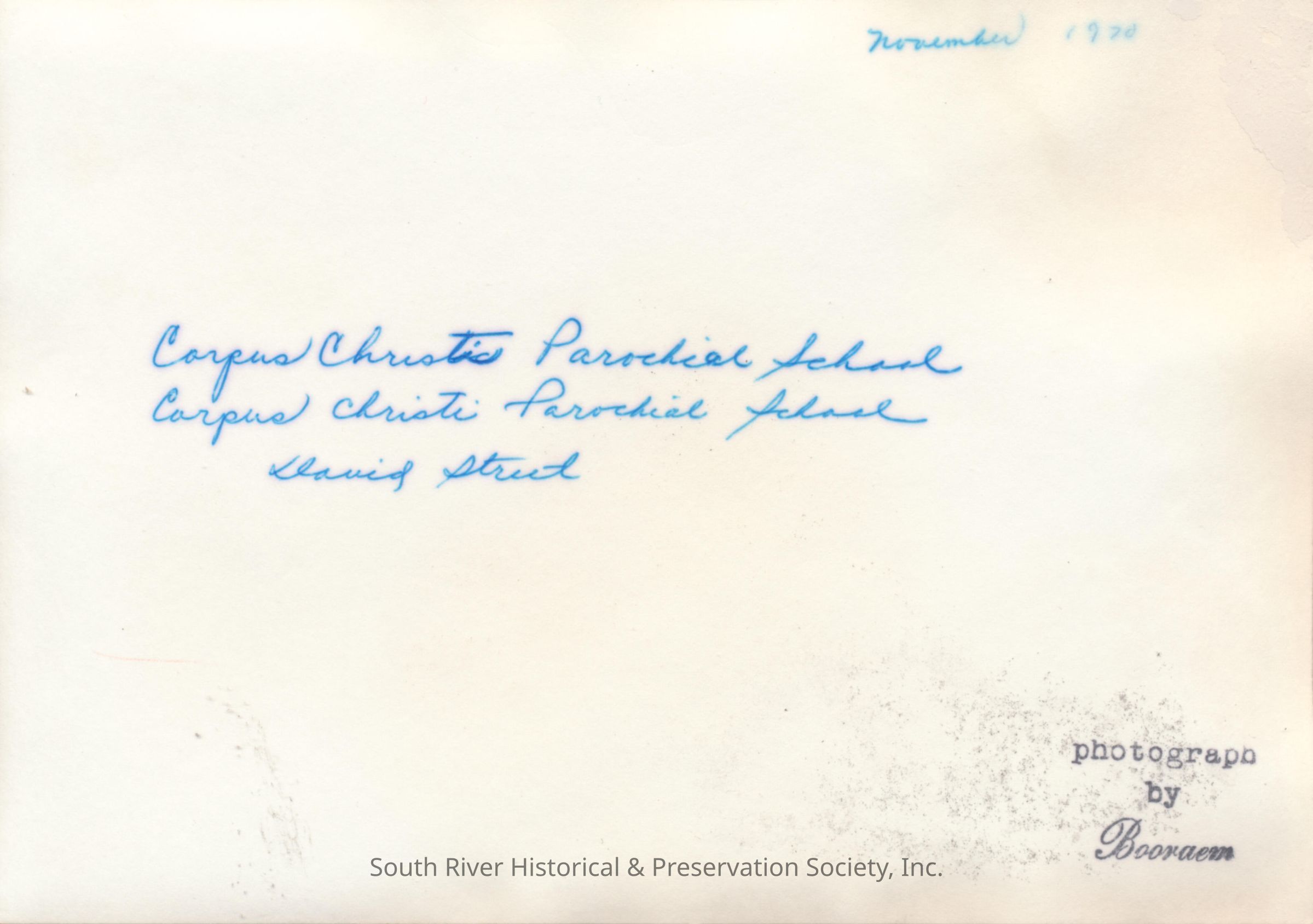 A note handwritten on the back in blue ink reads "November 1970; Corpus Christi Parochial School, Corpus Christi Parochial School, David Street."