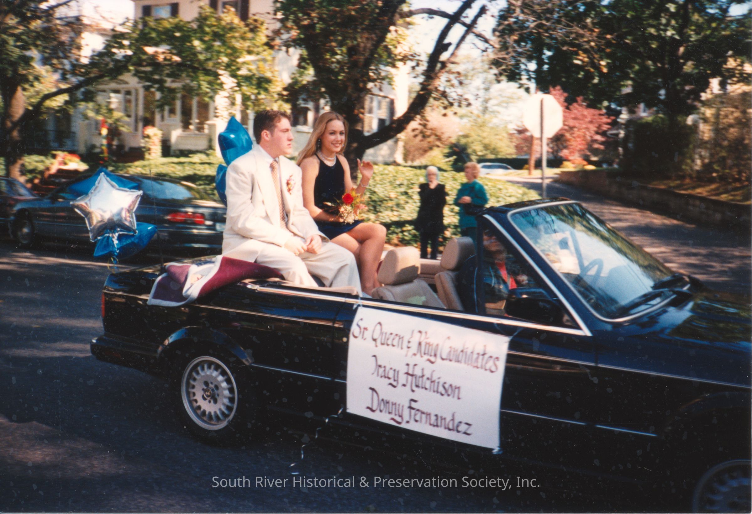 Color photograph of South River High School Senior king and queen candidates in the parade for South River's 275th Anniversary on October 22, 1995. The pair is riding on the back of a black convertible with a hand-lettered sign reading, "Sr. Queen & King Candidates, Tracy Hutchison, Donny Fernandez."