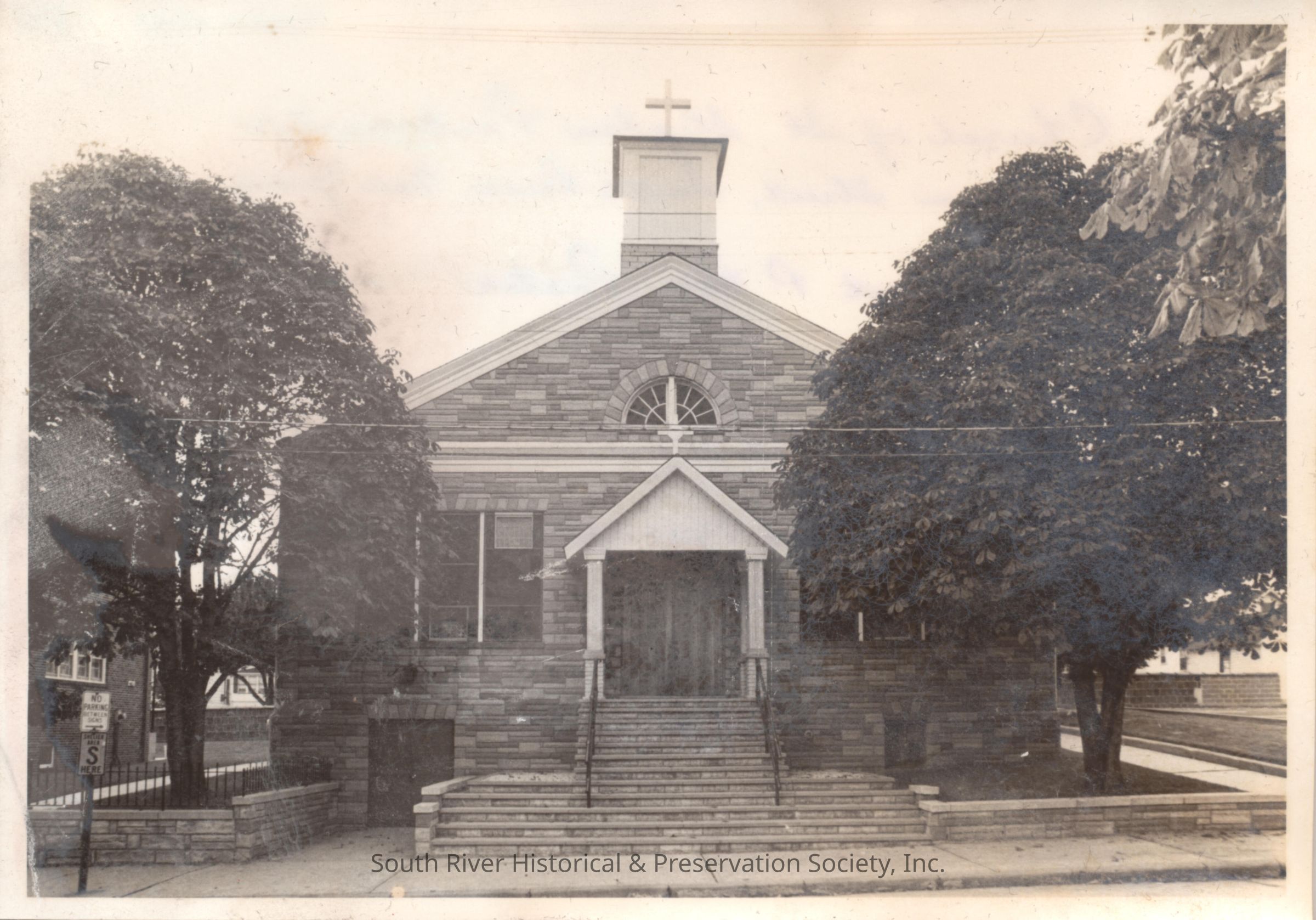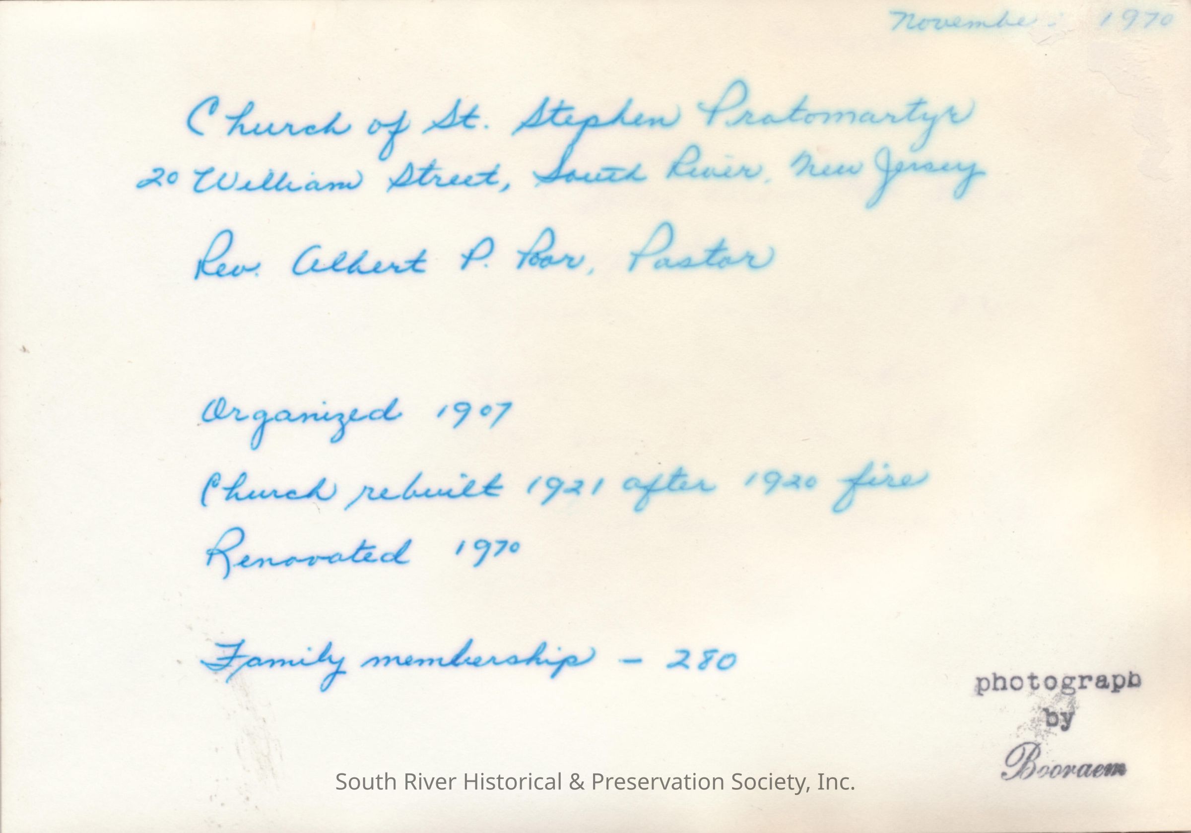 A note handwritten on the back in blue ink reads "November 1970; Church of St. Stephen Protomartyr, 20 William Street, South River, New Jersey; Rev. Albert P. Poor, Pastor; Organized 1907; Church rebuilt 1921 after 1920 fire; Renovated 1970; Family membership - 280."