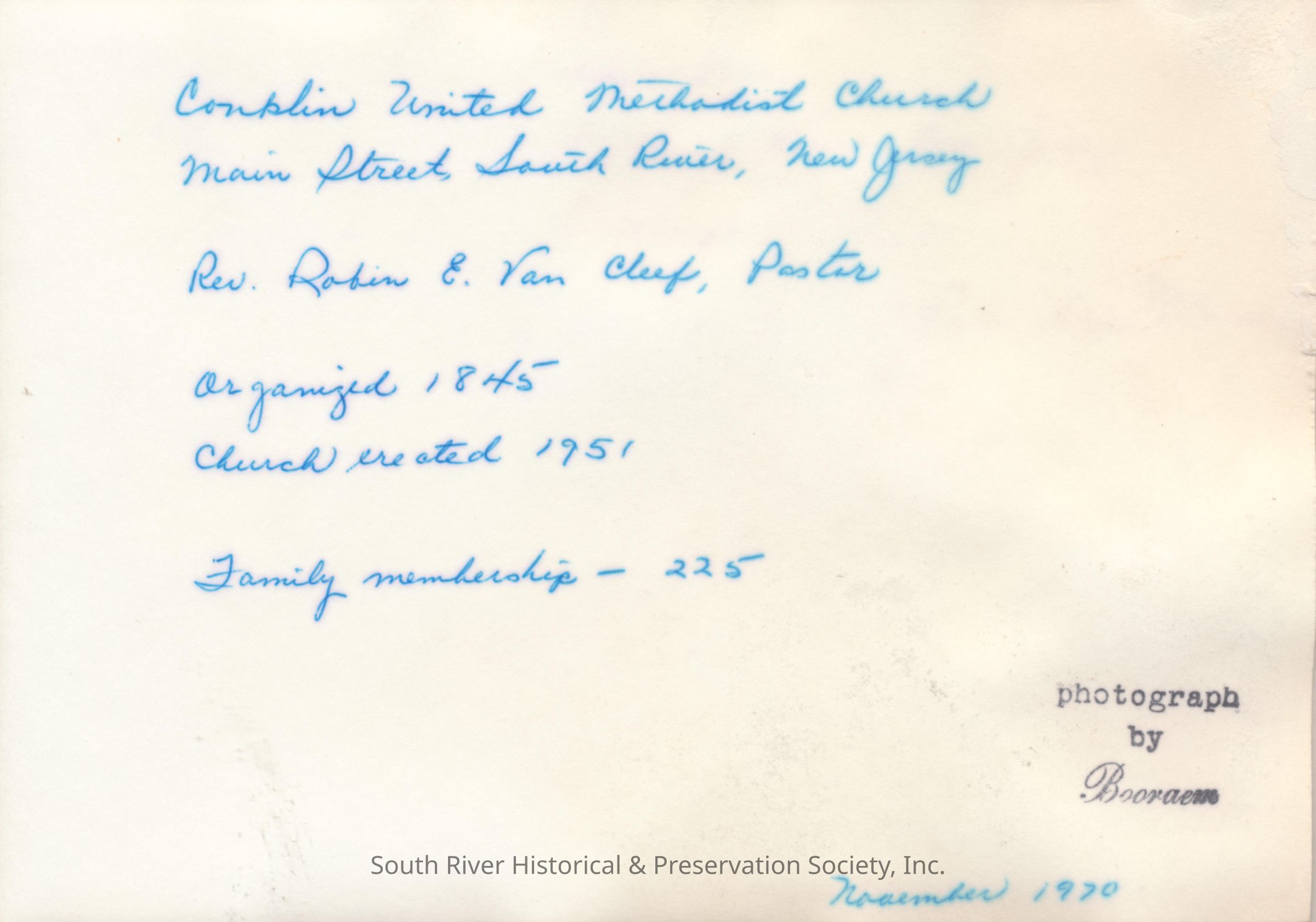 A note handwritten on the back in blue ink reads "Conklin United Methodist Church, Main Street, South River, New Jersey; Rev. Robin E. Van Cleef, Pastor; organized 1845; church erected 1951; Family membership - 225; November 1970."