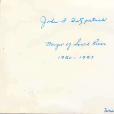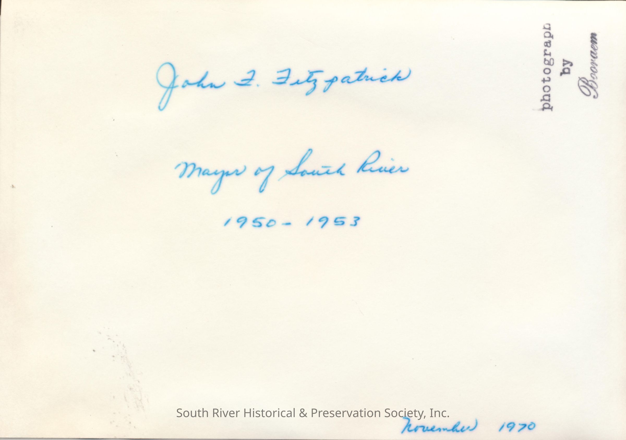 A note handwritten on the back in blue ink reads "John F. Fitzpatrick, Mayor of South River, 1950-1953; November 1970."
