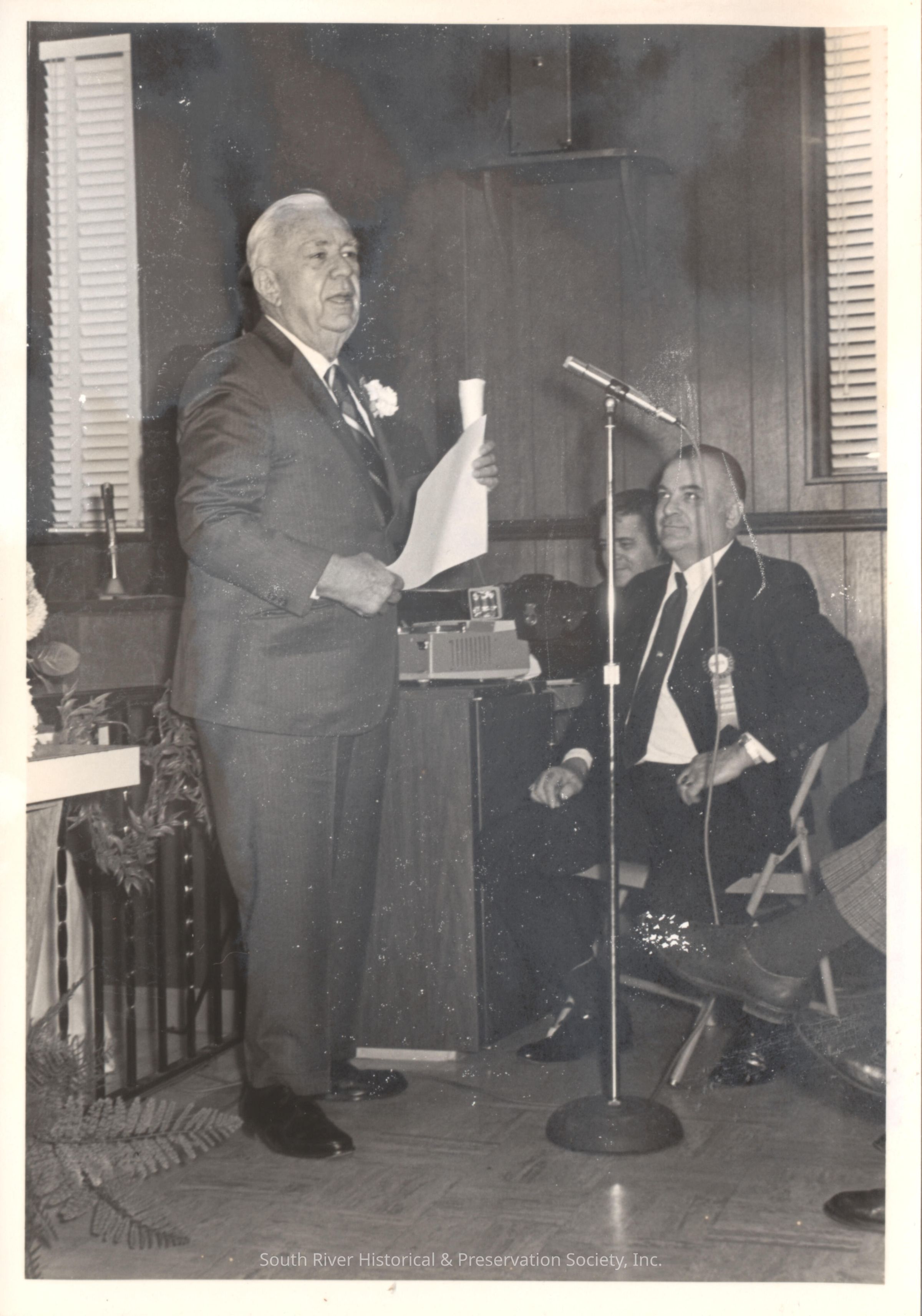 Photograph of former mayor John F. Fitzpatrick accepting the certificate presented to him in commemoration of South River's 250th anniversary. The presentation was part of the opening ceremony held in the Council chambers in the Borough Hall on November 6, 1970. The two men seated at the right are unidentified.