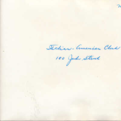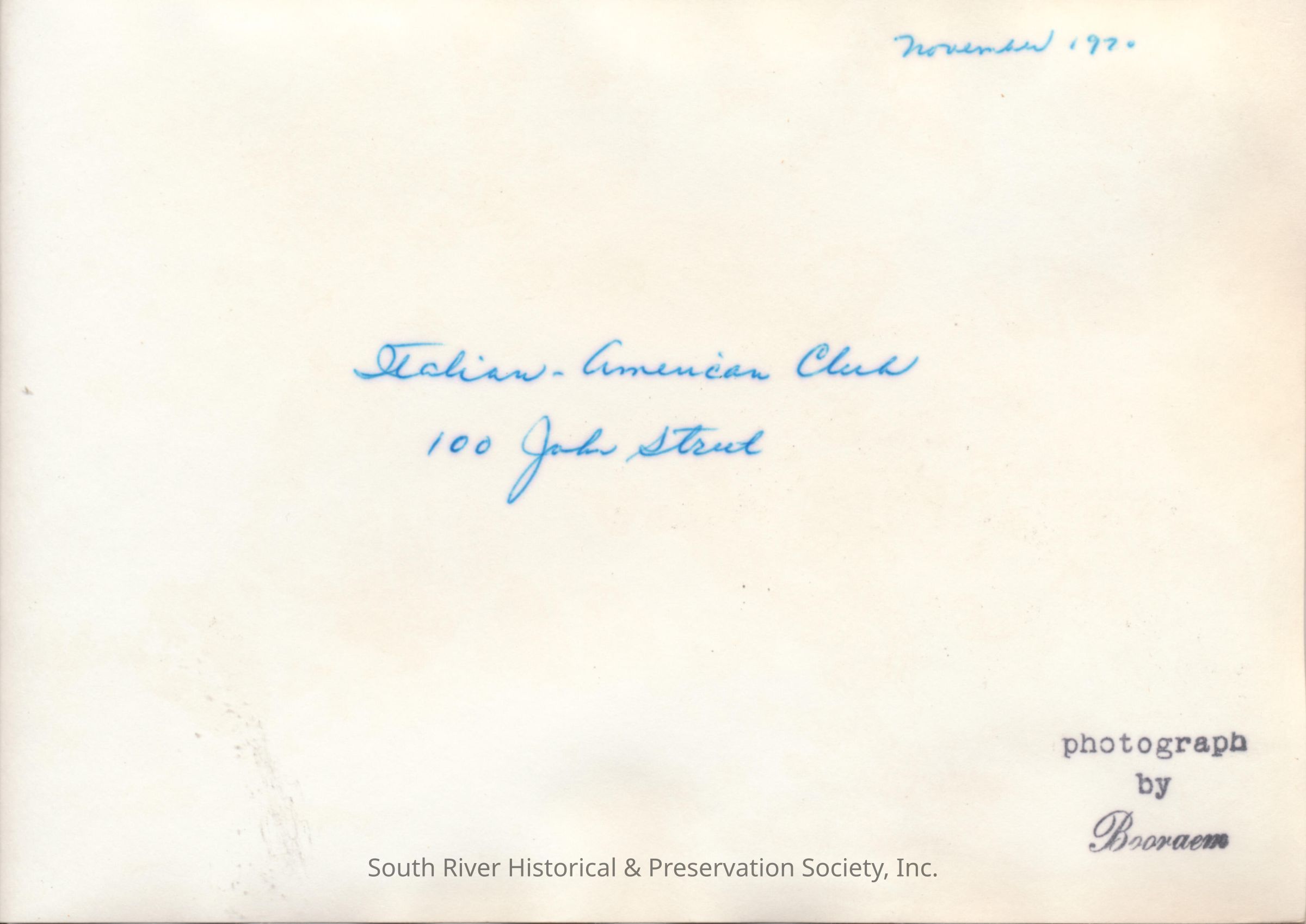 A note handwritten on the back in blue ink reads "November 1970; Italian-American Club, 100 John Street."