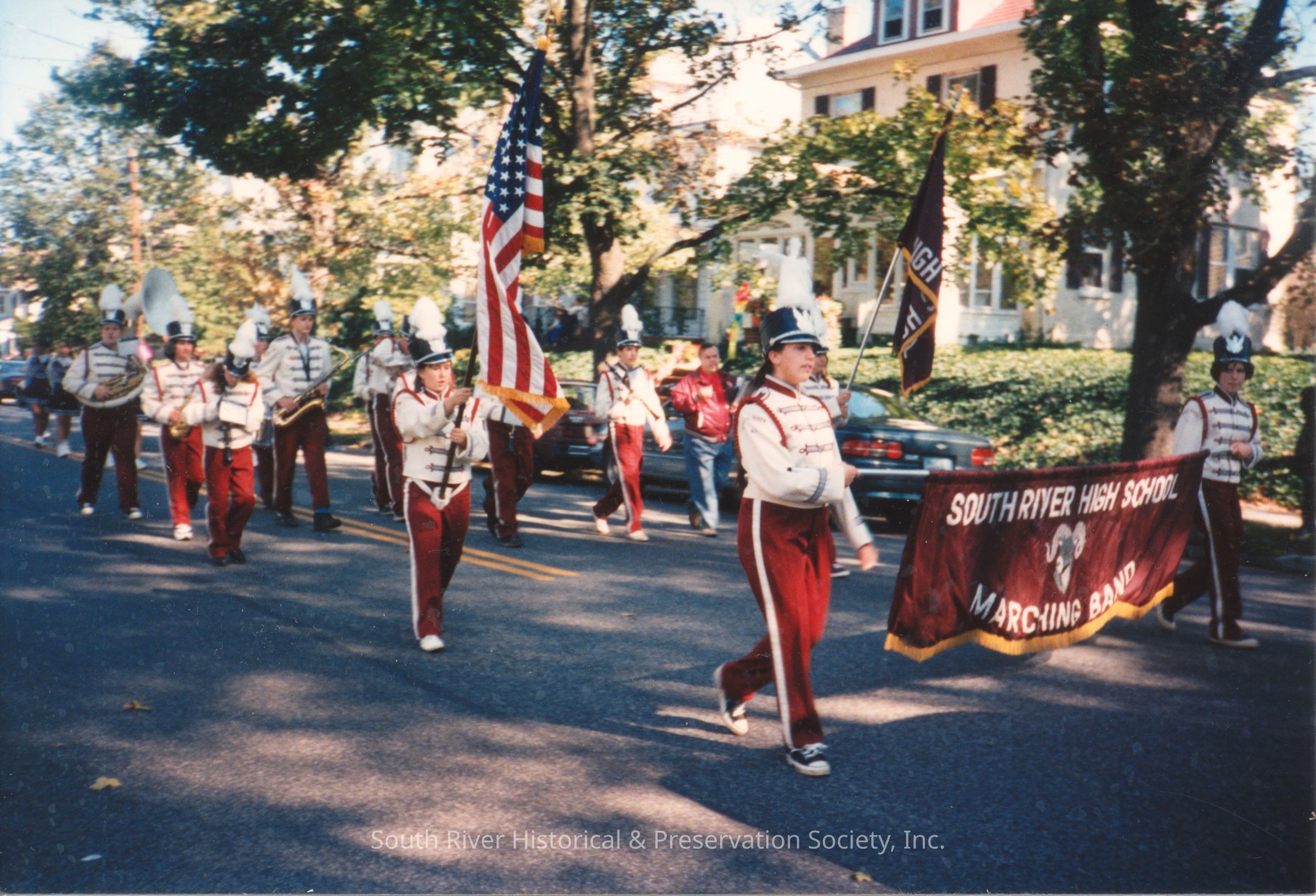 Color photograph of the South River High School Marching Band in the parade for South River's 275th Anniversary on October 22, 1995.