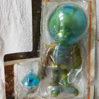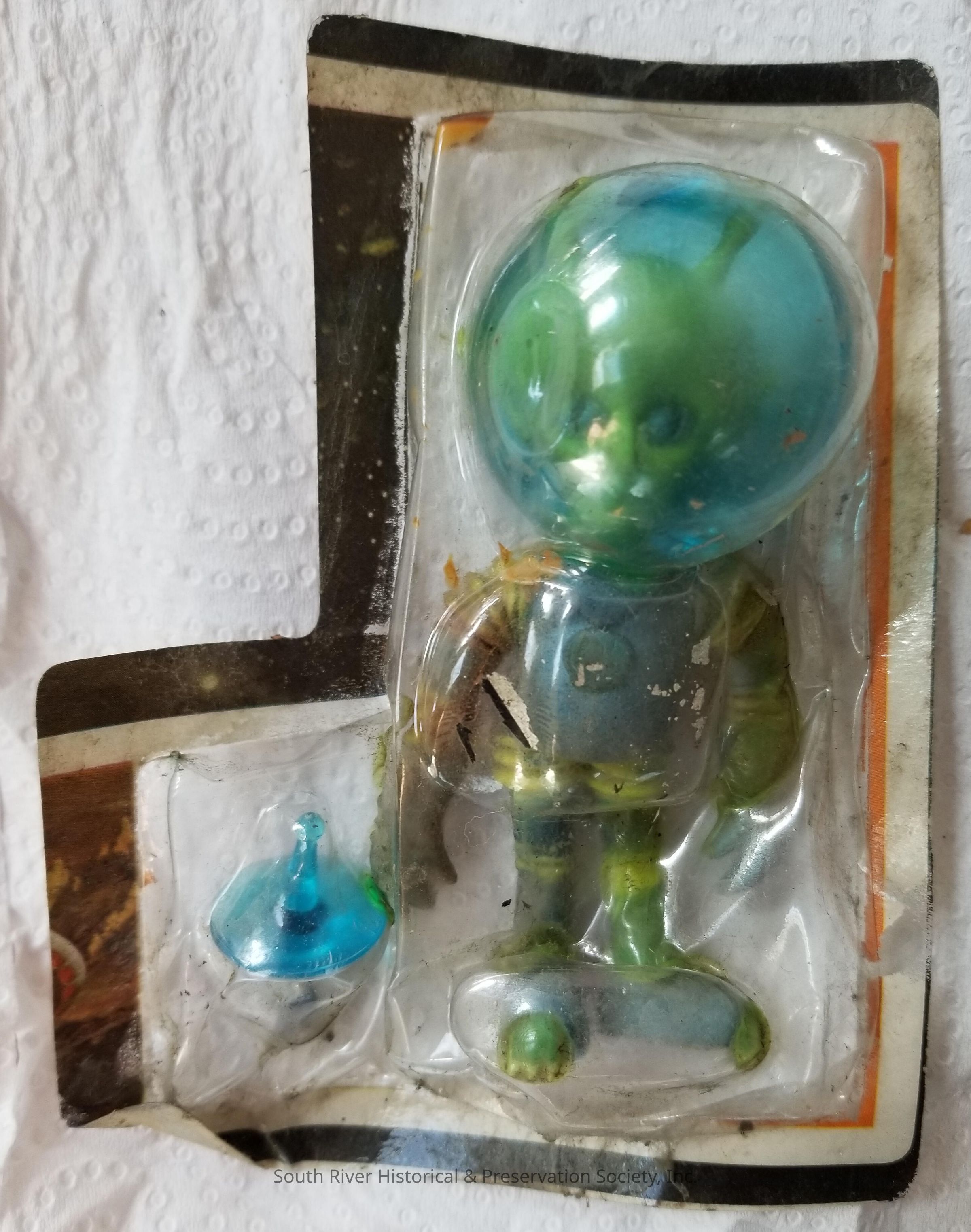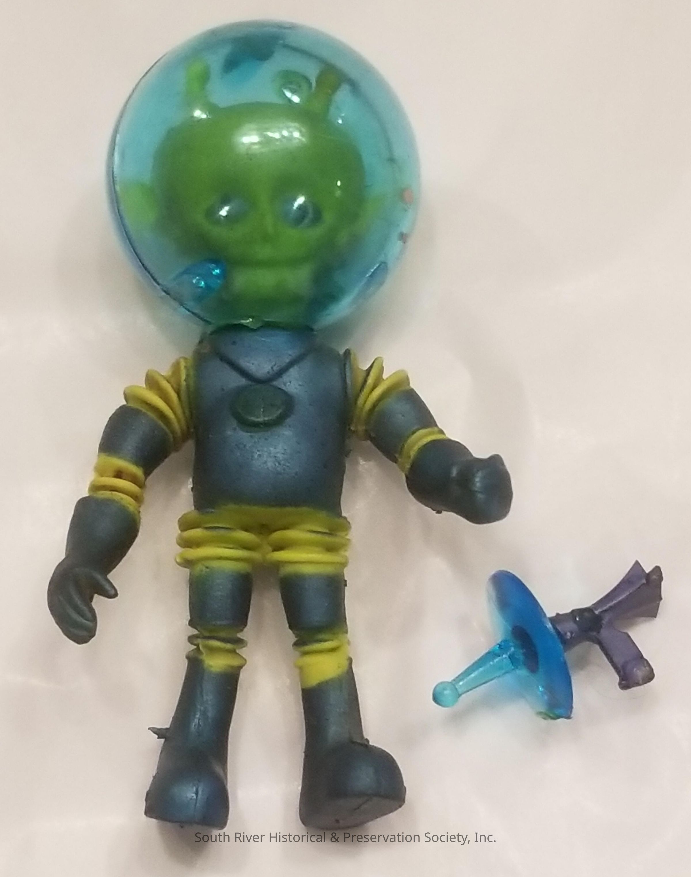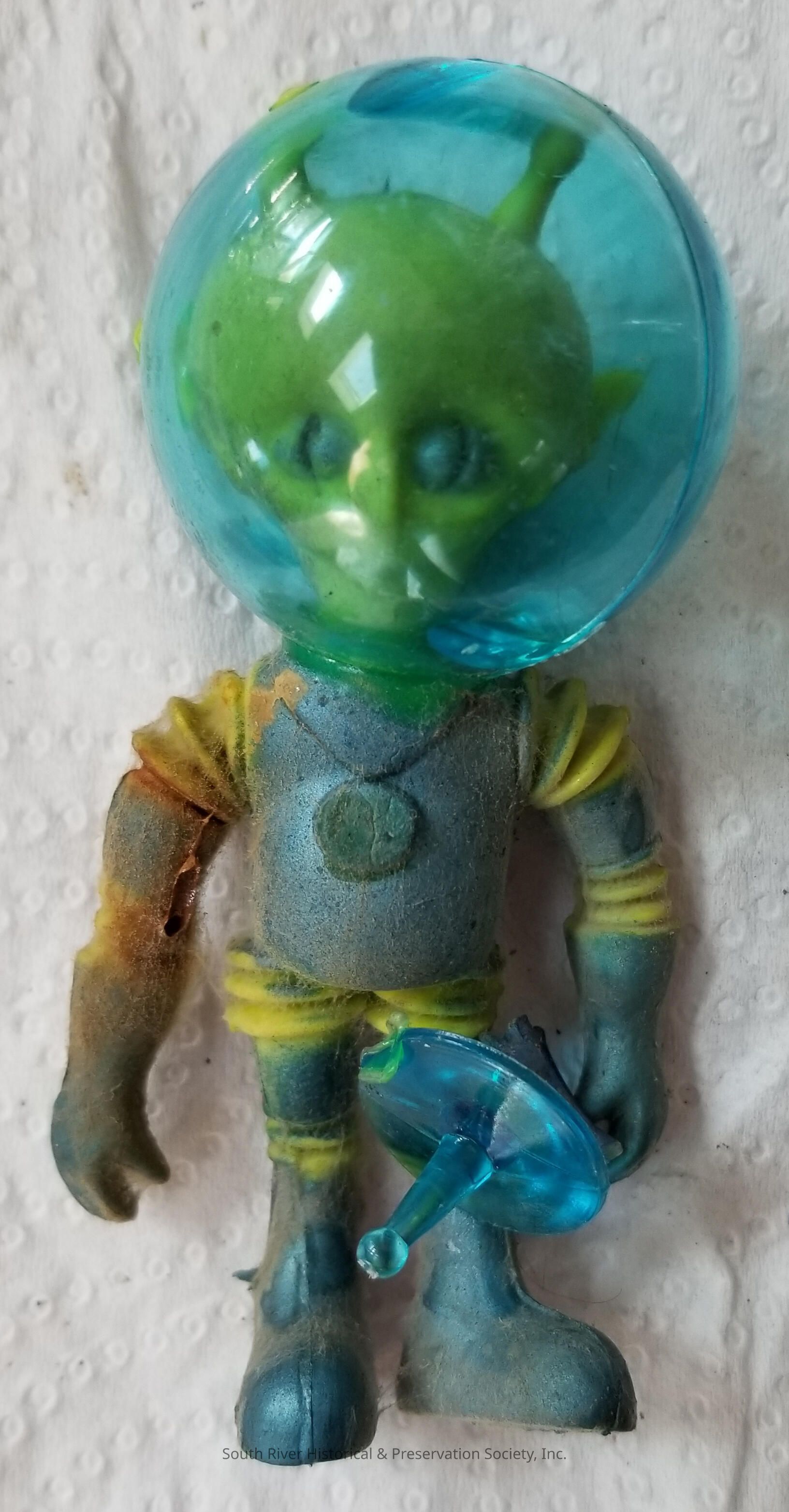 Alpha 7, the Man from Mars flexible action figure with ray gun. One of "The Outer Space Men" collection by Colorforms.