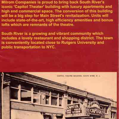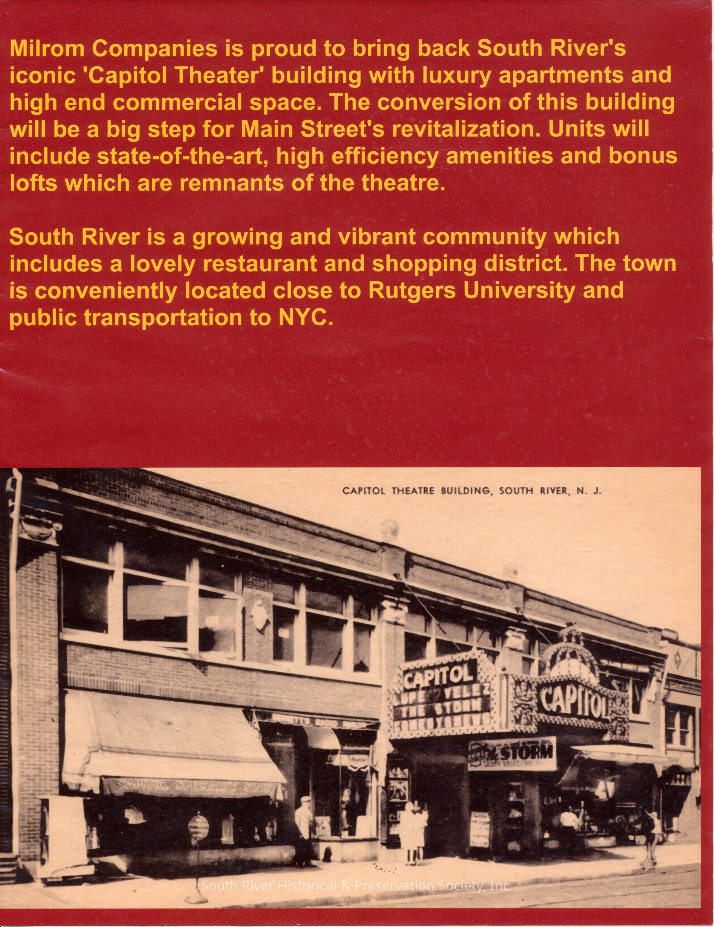 The text reads, "Milrom Companies is proud to bring back South River's iconic "Capitol Theater" building with luxury apartments and high end commercial space. The conversion of this building will be a big step for Main Street's revitalization. Units will include state-of the-art, high efficiency amentities and bonus lofts which are remnants of the theatre.