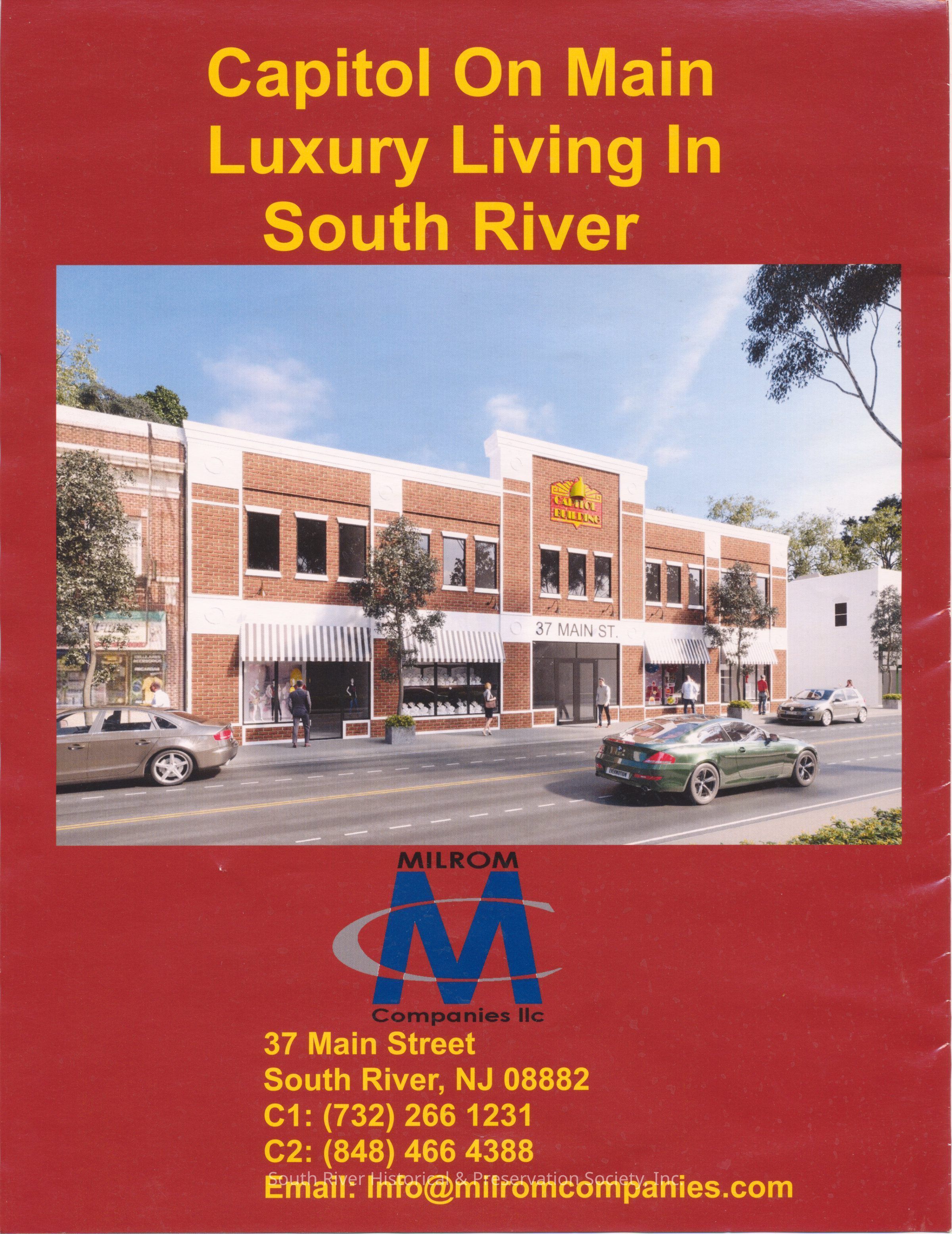 Advertising brochure for the Capitol Building located at 37 Main Street, South River. One side of the folded sheet has a red background with an architect's rendering of the building; contact information for the developer, Milrom Companies LLC; a postcard image of the Capitol Theatre Building; and text.