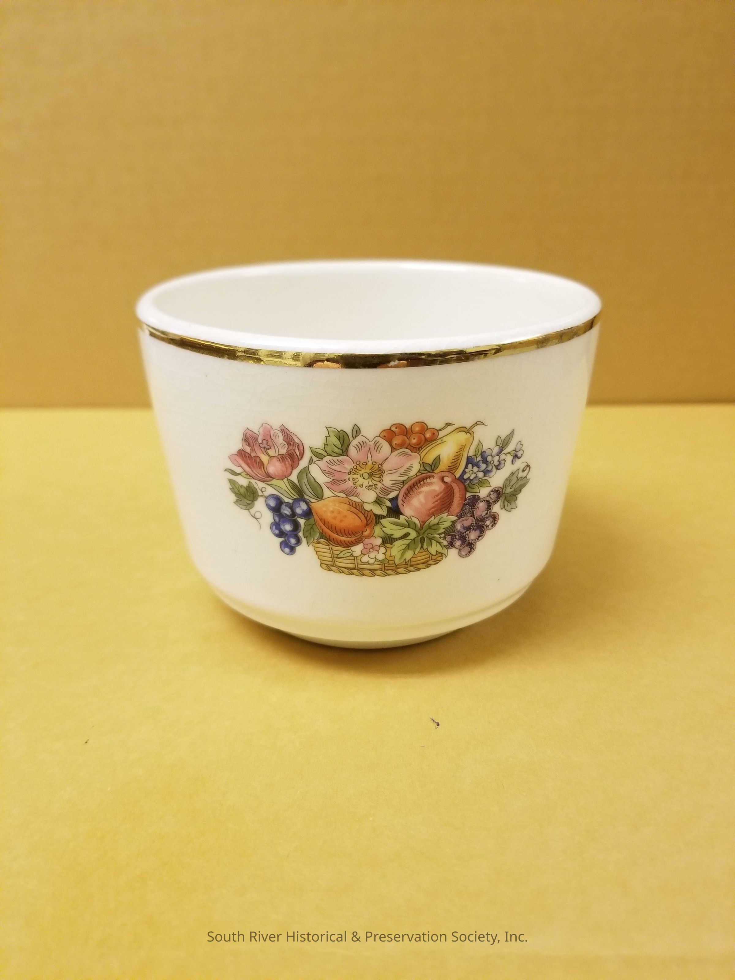 Off-white ceramic ramekin or individual serving bowl with a 22k gold edge around the rim. The front has a multi-colored fruit floral basket design. Distributed at Capitol Theatre, circa 1944-1946.