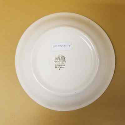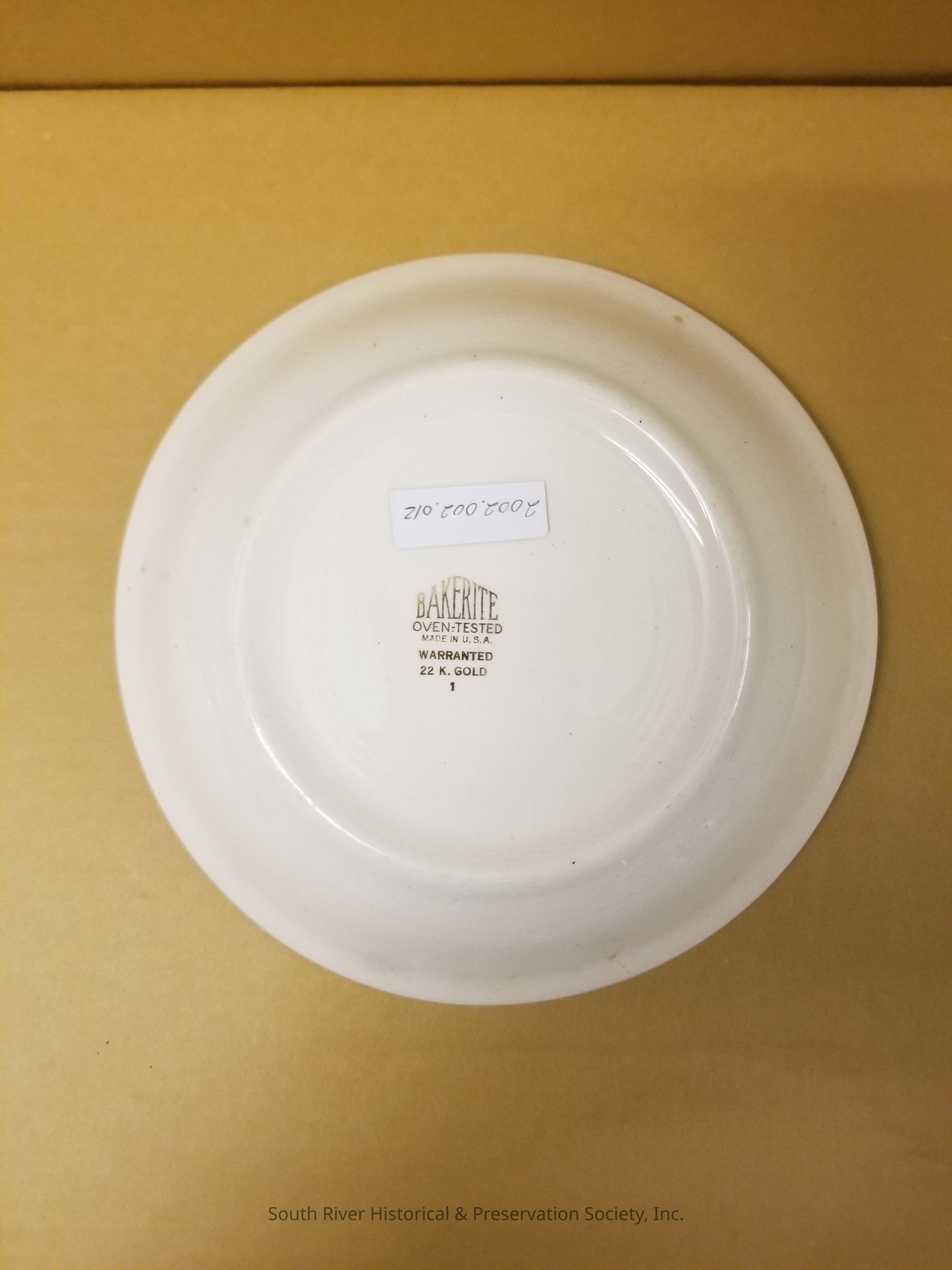 Bottom of bowl has gold lettering that reads, "Bakerite Oven-Tested, Made in U.S.A., Warranted 22 K. Gold, 1."Acquisition