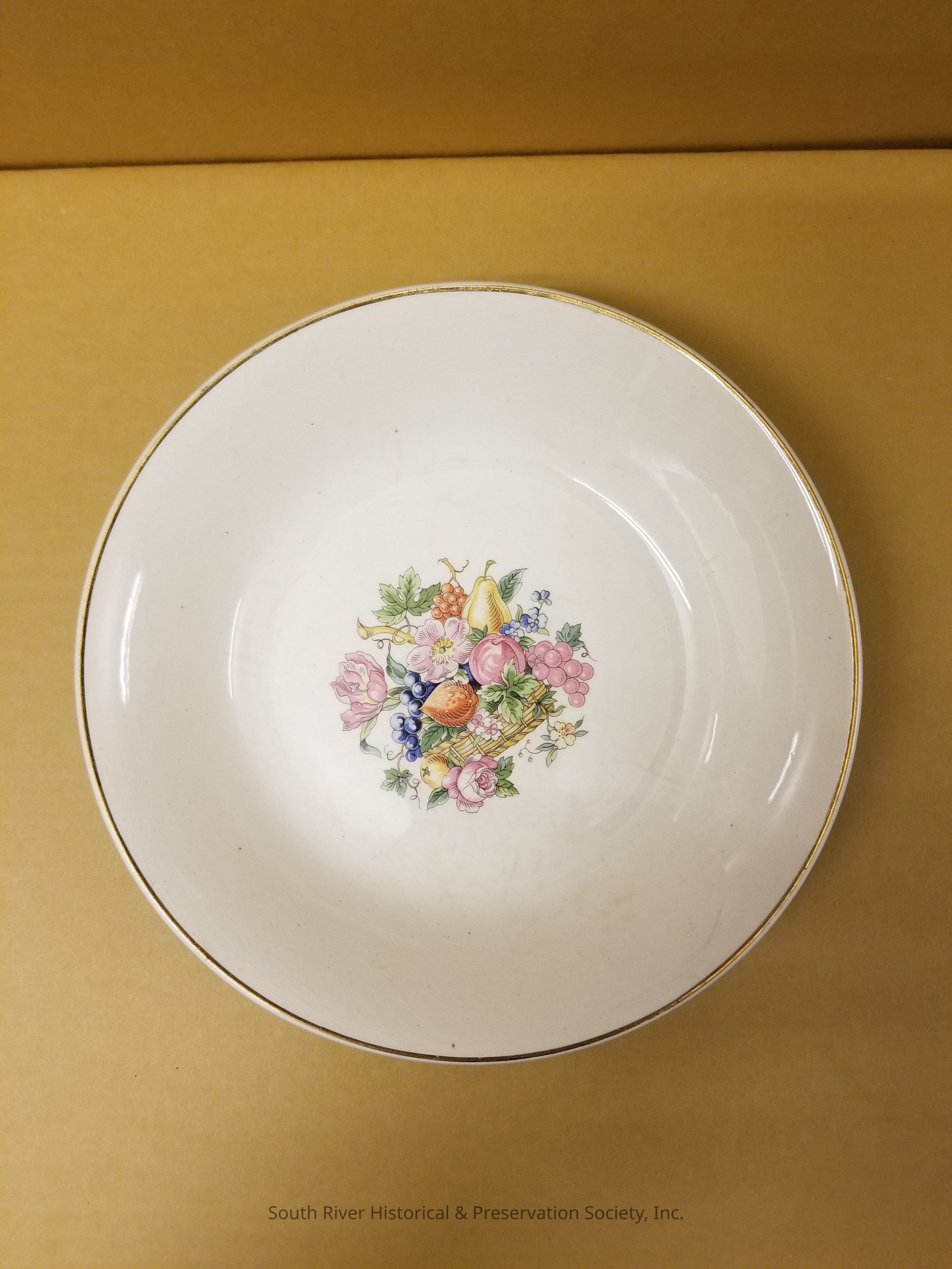 Off-white ceramic soup bowl with a 22k gold edge around the rim. The interior of the bowl has a multi-colored fruit floral basket design. Distributed at Capitol Theatre, circa 1944-1946.