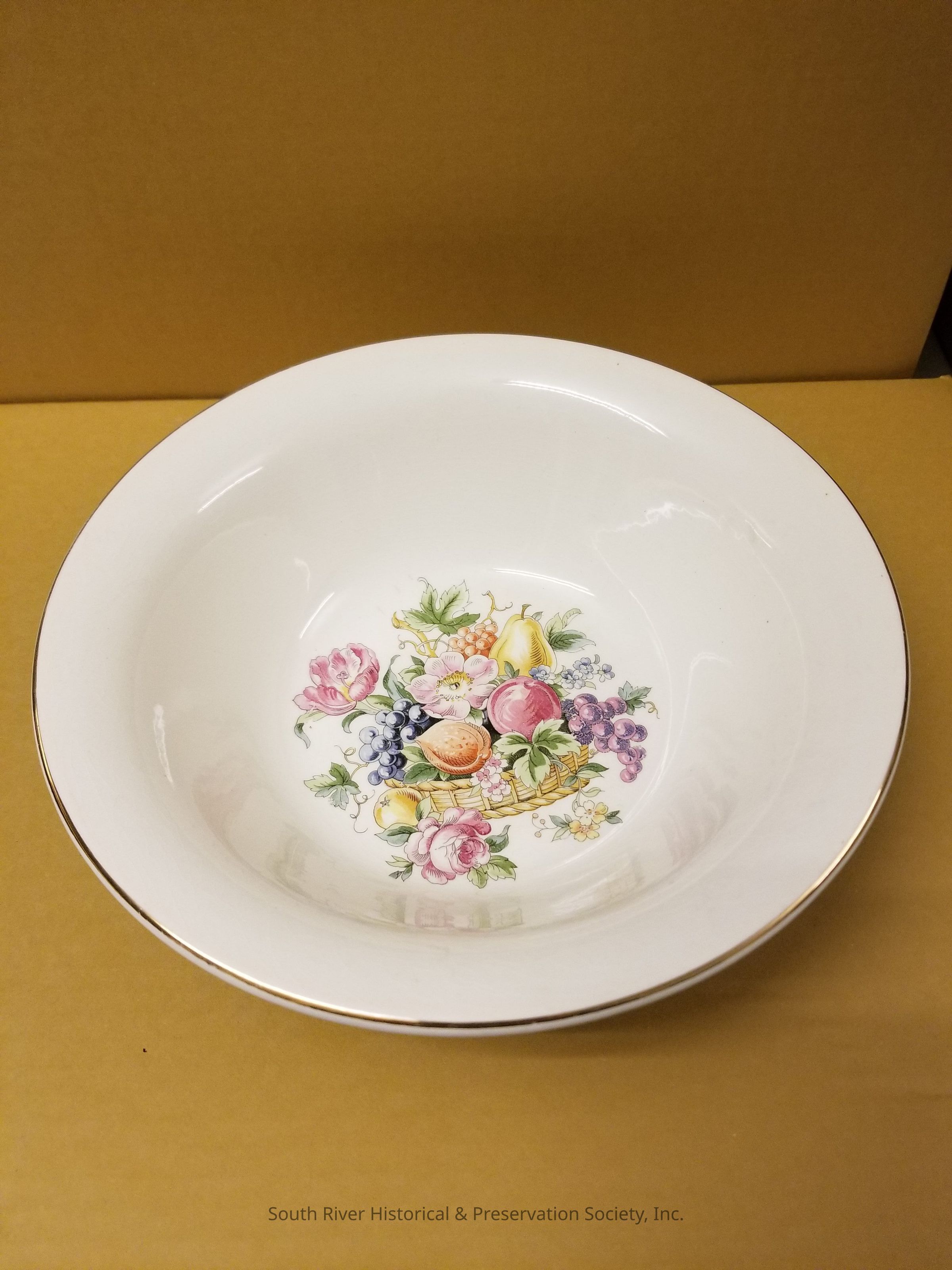 Off-white ceramic serving bowl with a 22k gold edge around the rim. The interior of the bowl has a multi-colored fruit floral basket design. Distributed at Capitol Theatre, circa 1944-1946.