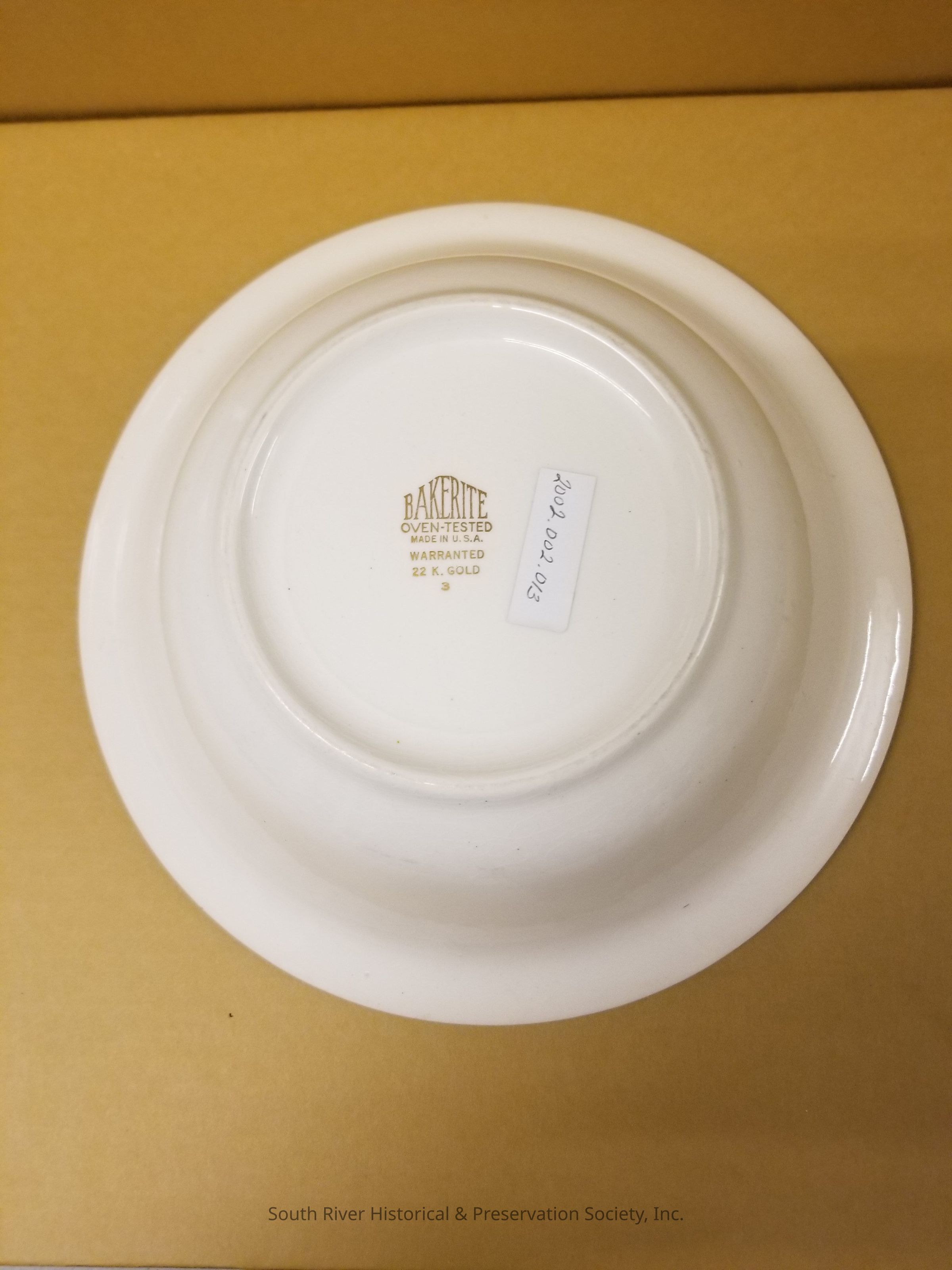 Bottom of bowl has gold lettering that reads, "Bakerite Oven-Tested, Made in U.S.A., Warranted 22 K. Gold, 3."Acquisition