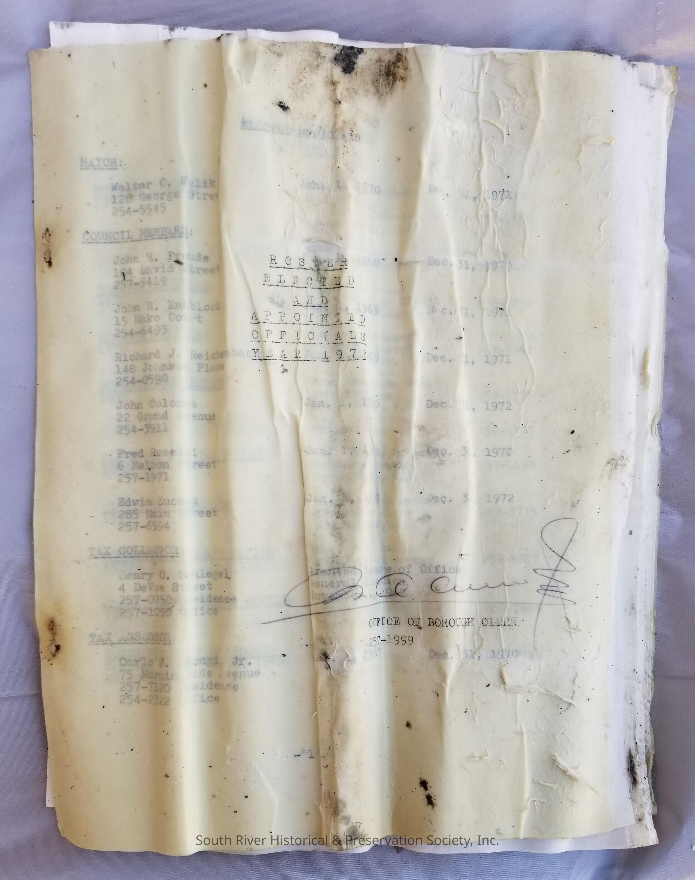 Roster listing South River's elected and appointed officials for the year 1970. The title page is signed by the Borough Clerk, but is translucent so that the first page of text is visible.