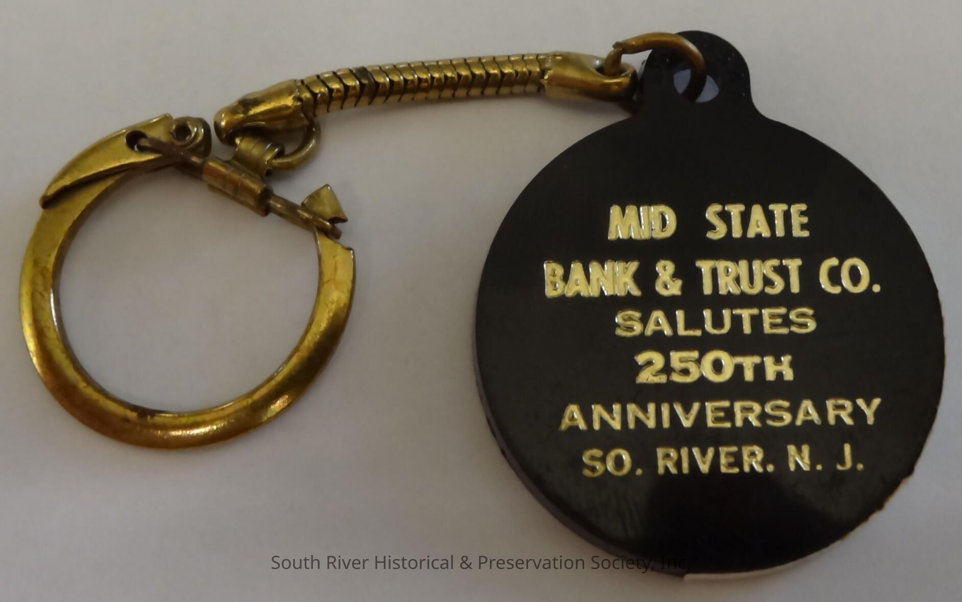 Keychain commemorating South River's 250th anniversary in 1970. The decorative portion of the keychain is round and imprinted "Mid State Bank and Trust Co. Salutes 250th Anniversary So. River. N.J."