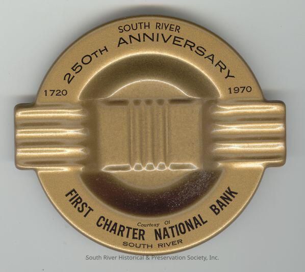 Lettering around the rim reads, "South River, 250th Anniversary, 1720 - 1970" and "Courtesy of First Charter National Bank, South River."Acquisition