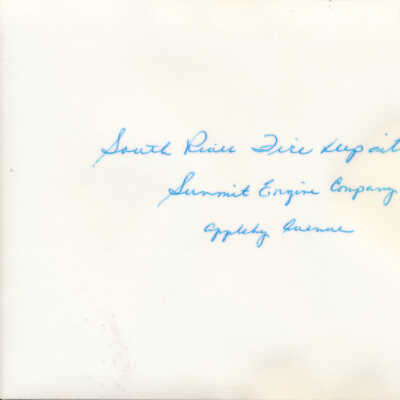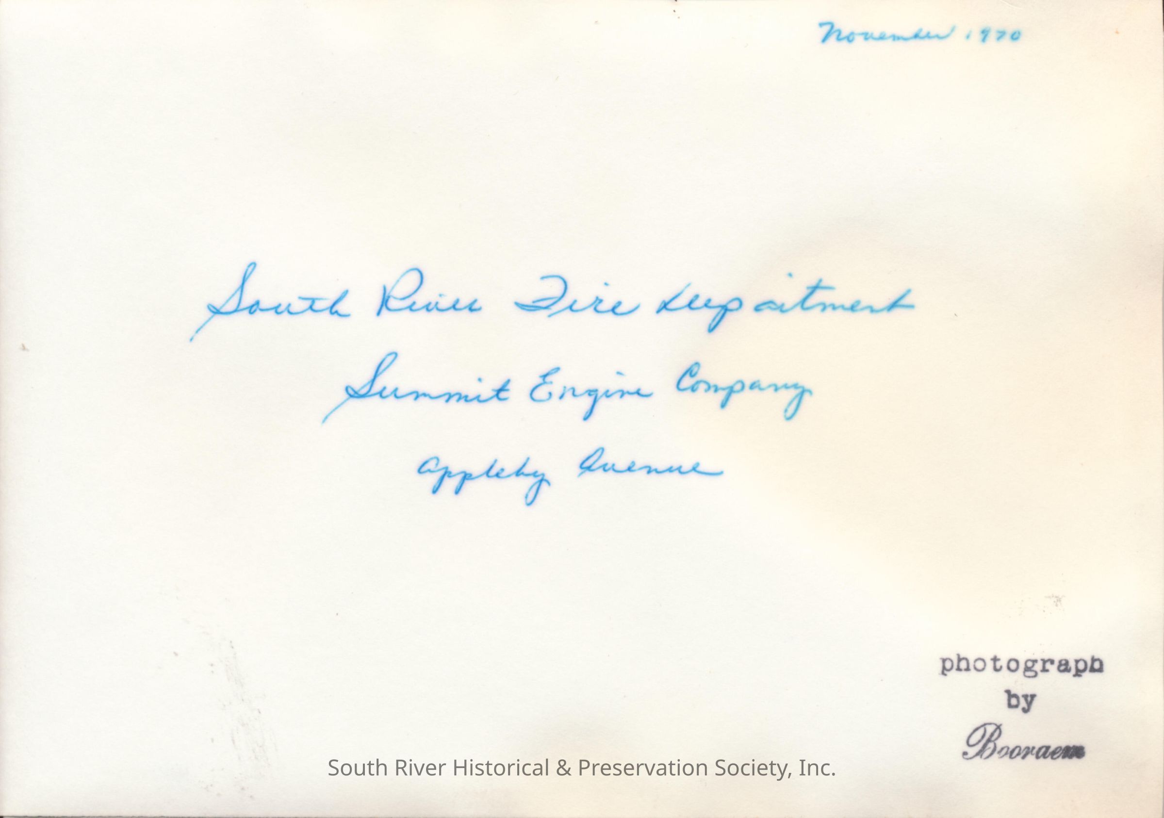 A note handwritten on the back in blue ink reads "November 1970; South River Fire Department, Summit Engine Company, Appleby Avenue."