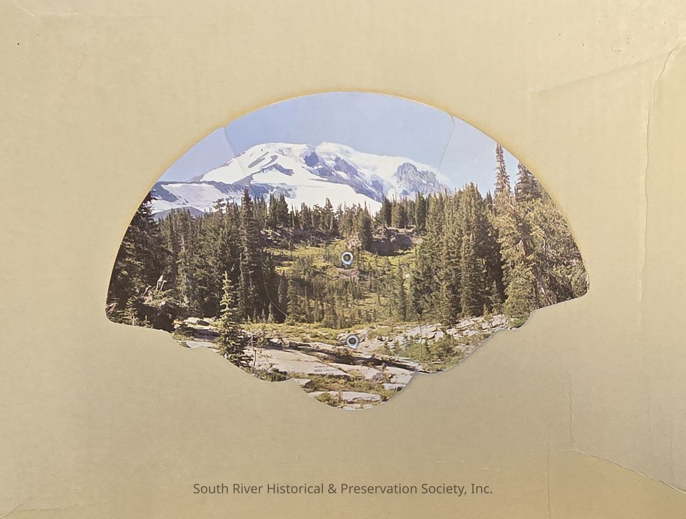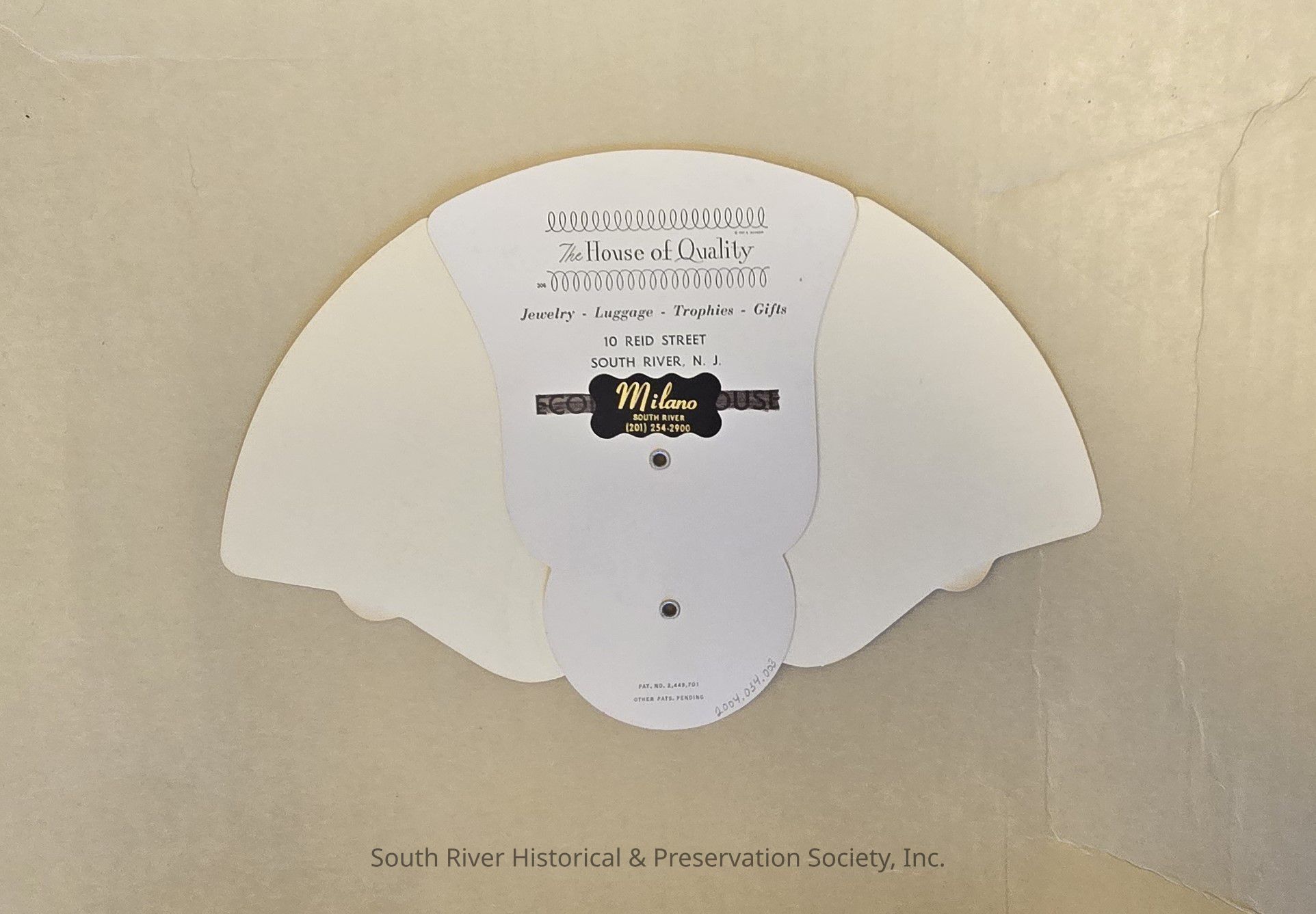 Folding hand fan with a scenic landscape of "Majestic Mt. Adams" on the front. The imprint on the back of the fan reads, "The House of Quality; Jewelry - Luggage - Trophies - Gifts; 10 Reid Street, South River, N.J." A sticker for "Milano, South River, (201) 254-2900" has been placed over the words "Economy House."