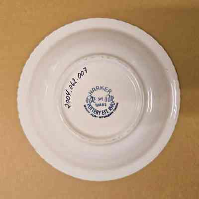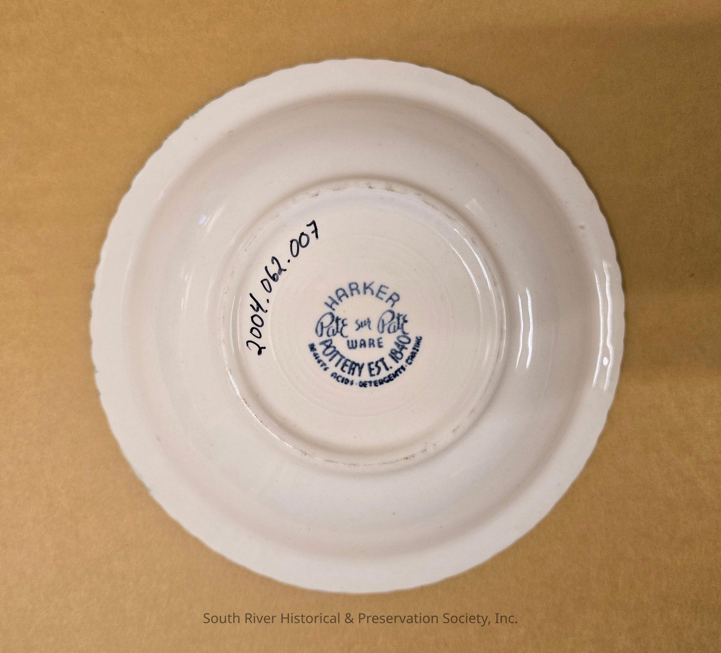 The bottom of the bowl has blue lettering that reads, " Harker Pate sur Pate Ware Pottery, Est. 1840. Resists acid, detergents, craze."
