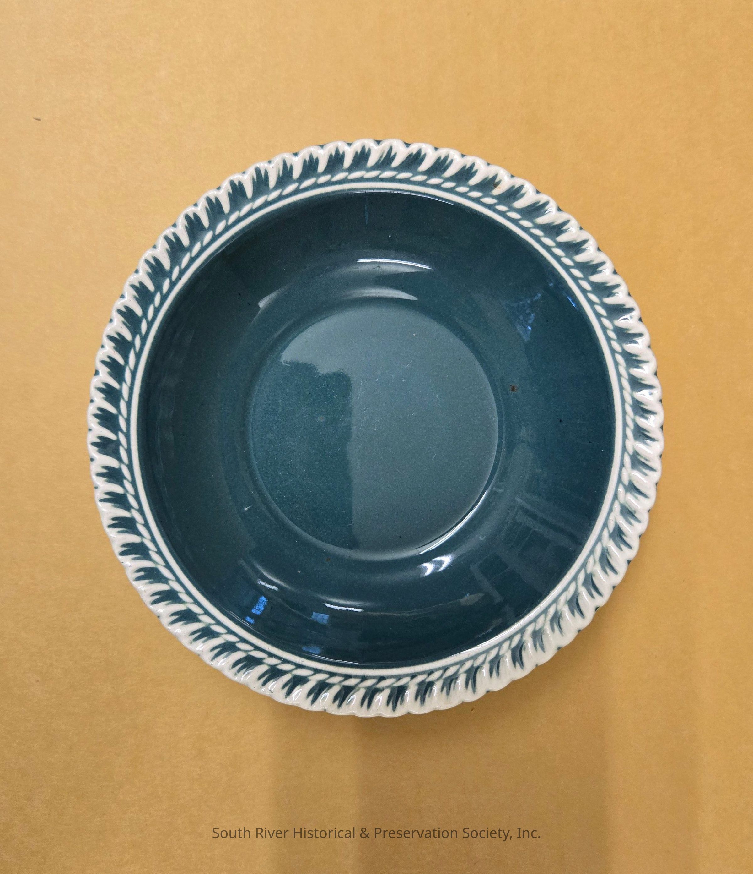 Dark teal green Corinthian pattern dessert bowl with a white feathery scalloped edge.