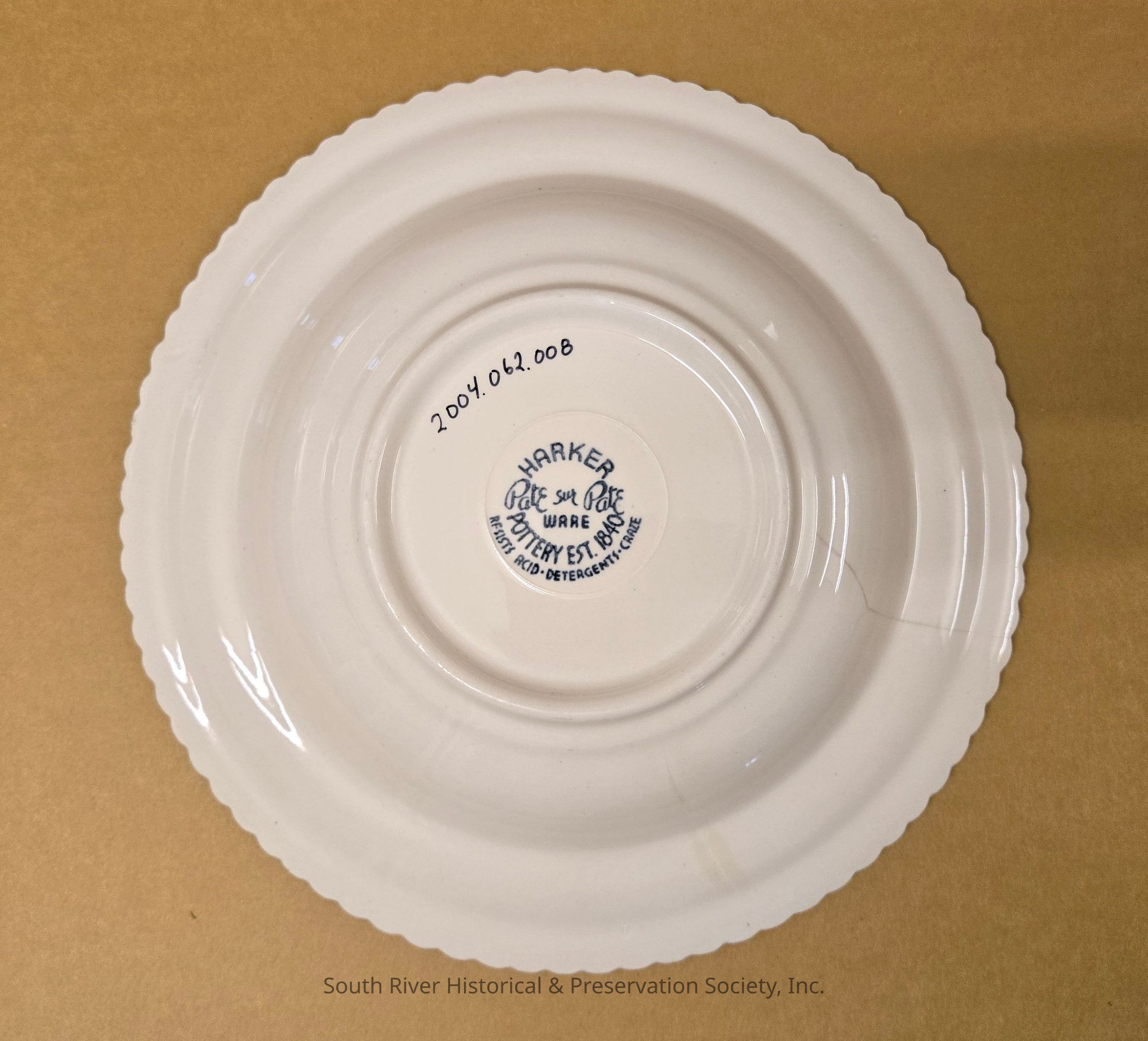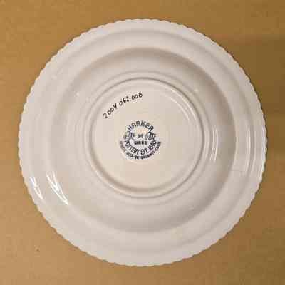 The bottom of the bowl has blue lettering that reads, " Harker Pate sur Pate Ware Pottery, Est. 1840. Resists acid, detergents, craze."
