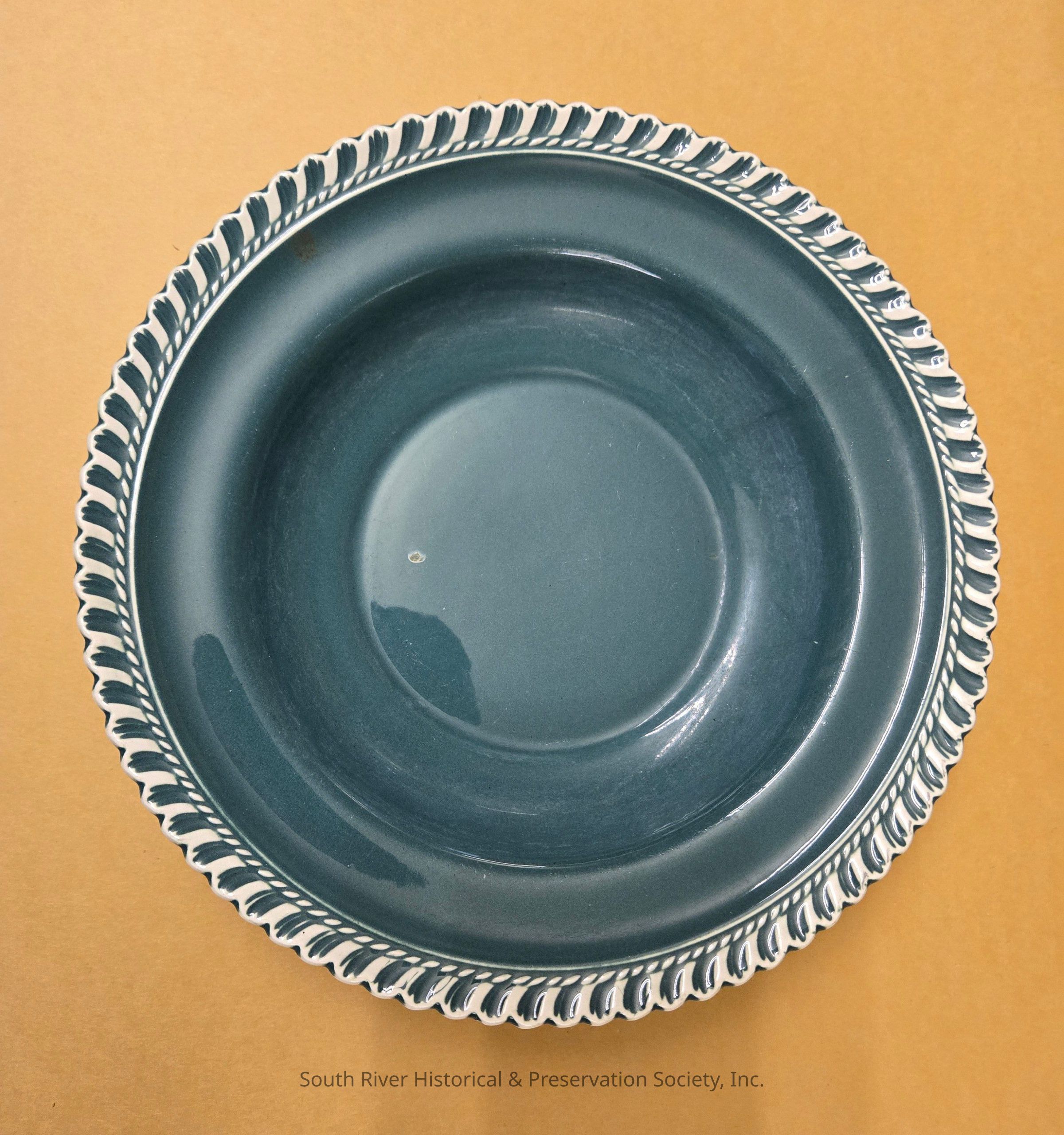 Dark teal green Corinthian pattern soup bowl with a white feathery scalloped edge.