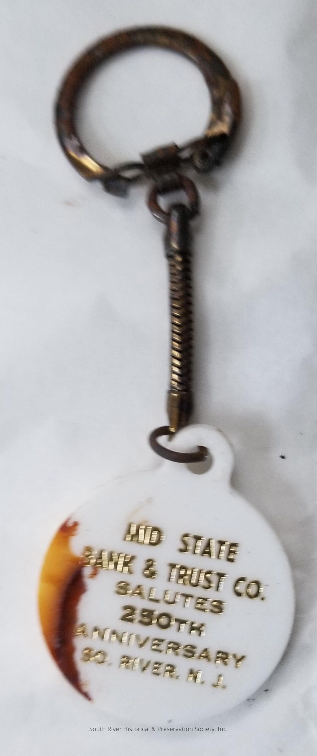 Keychain commemorating South River's 250th anniversary in 1970. The decorative portion of the keychain is round and imprinted "Mid State Bank and Trust Co. Salutes 250th Anniversary So. River. N.J."