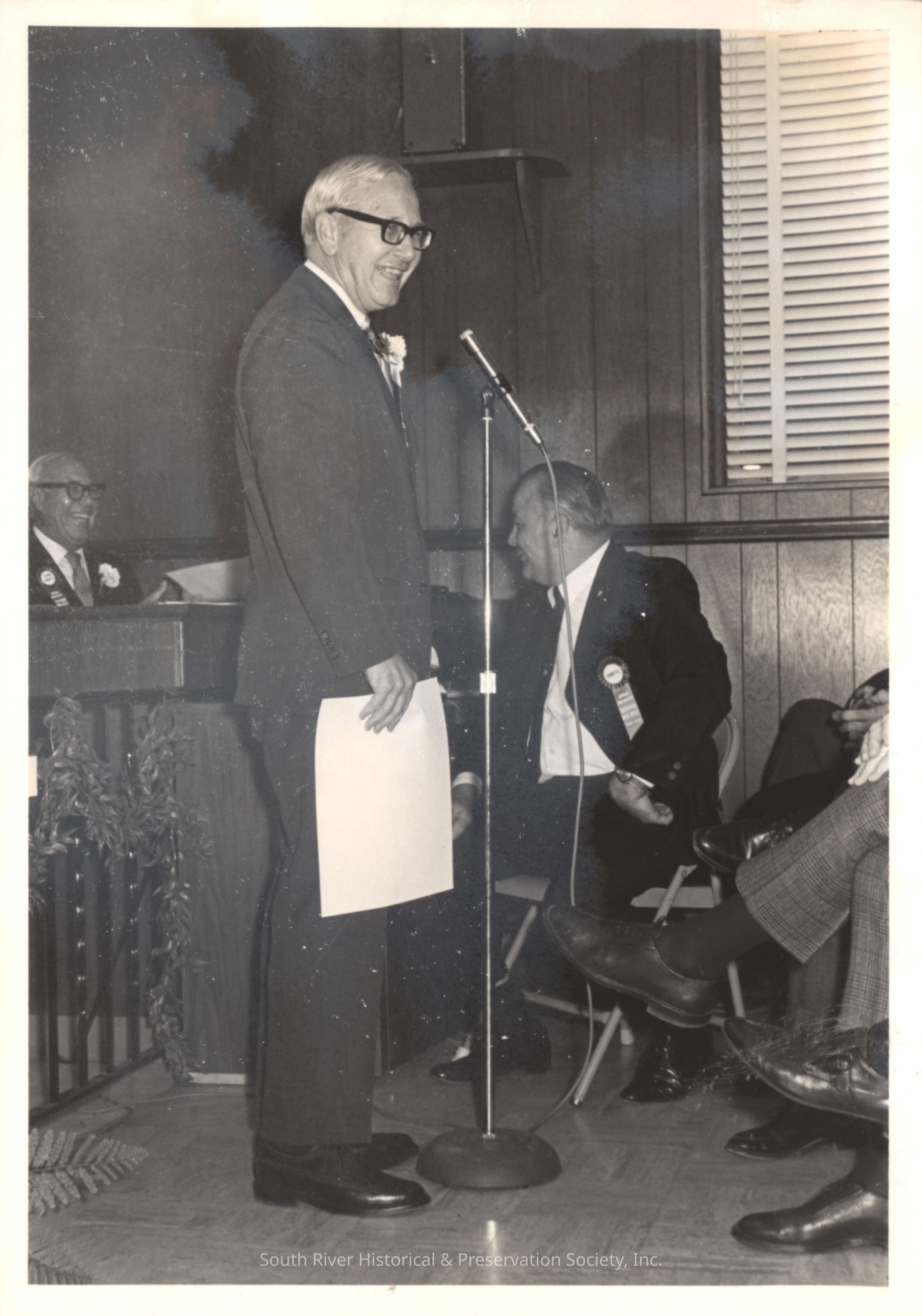 Photograph of former mayor Edmund J. Luker accepting the certificate presented to him in commemoration of South River's 250th anniversary. The presentation was part of the opening ceremony held in the Council chambers in the Borough Hall on November 6, 1970. Joseph Mark is visible at the left. The man seated at the right is unidentified.