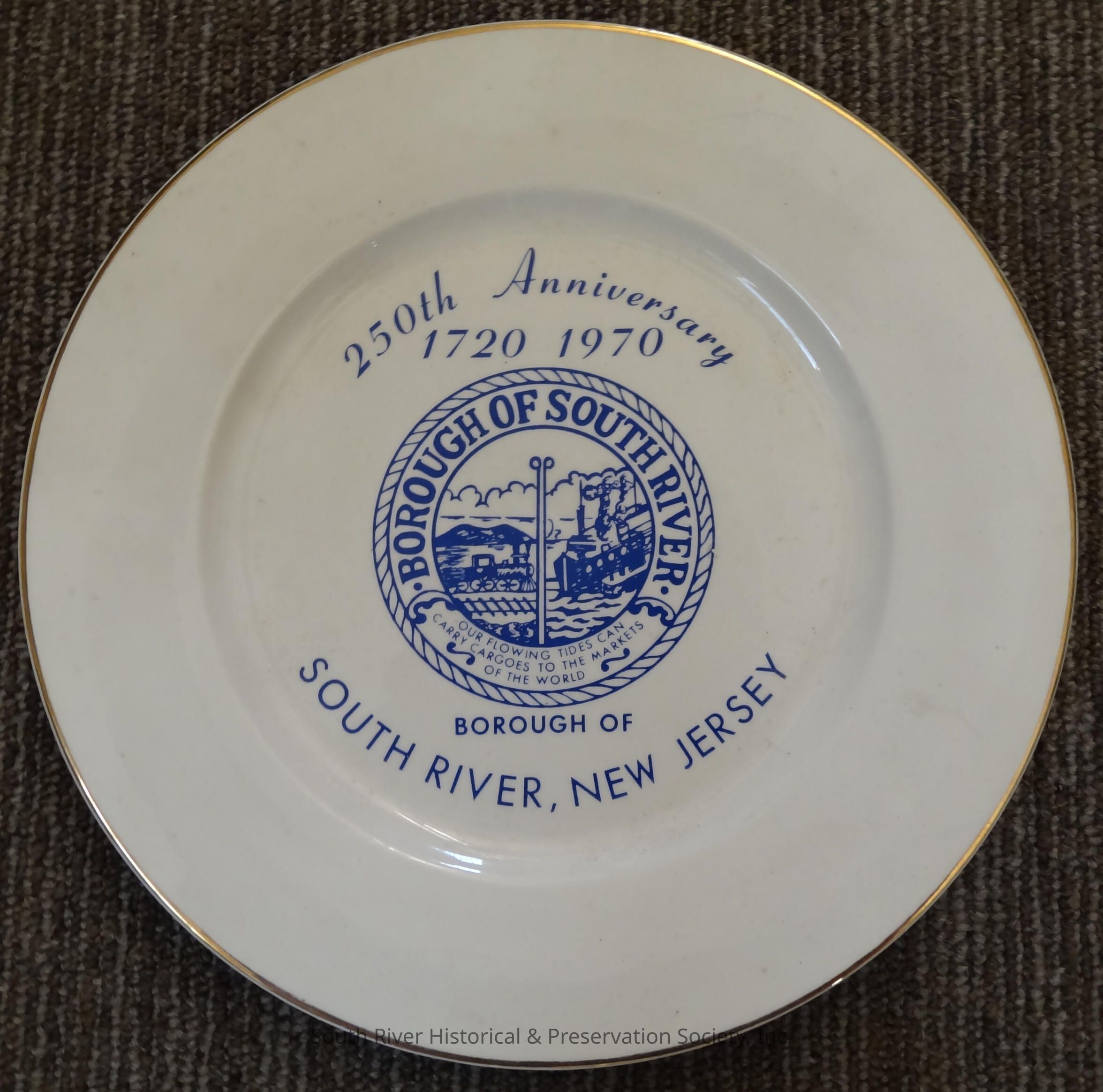Commemorative plate for the "250th Anniversary, 1720 - 1970, Borough of South River, New Jersey." Blue lettering and image on off-white plate w/gold rim.