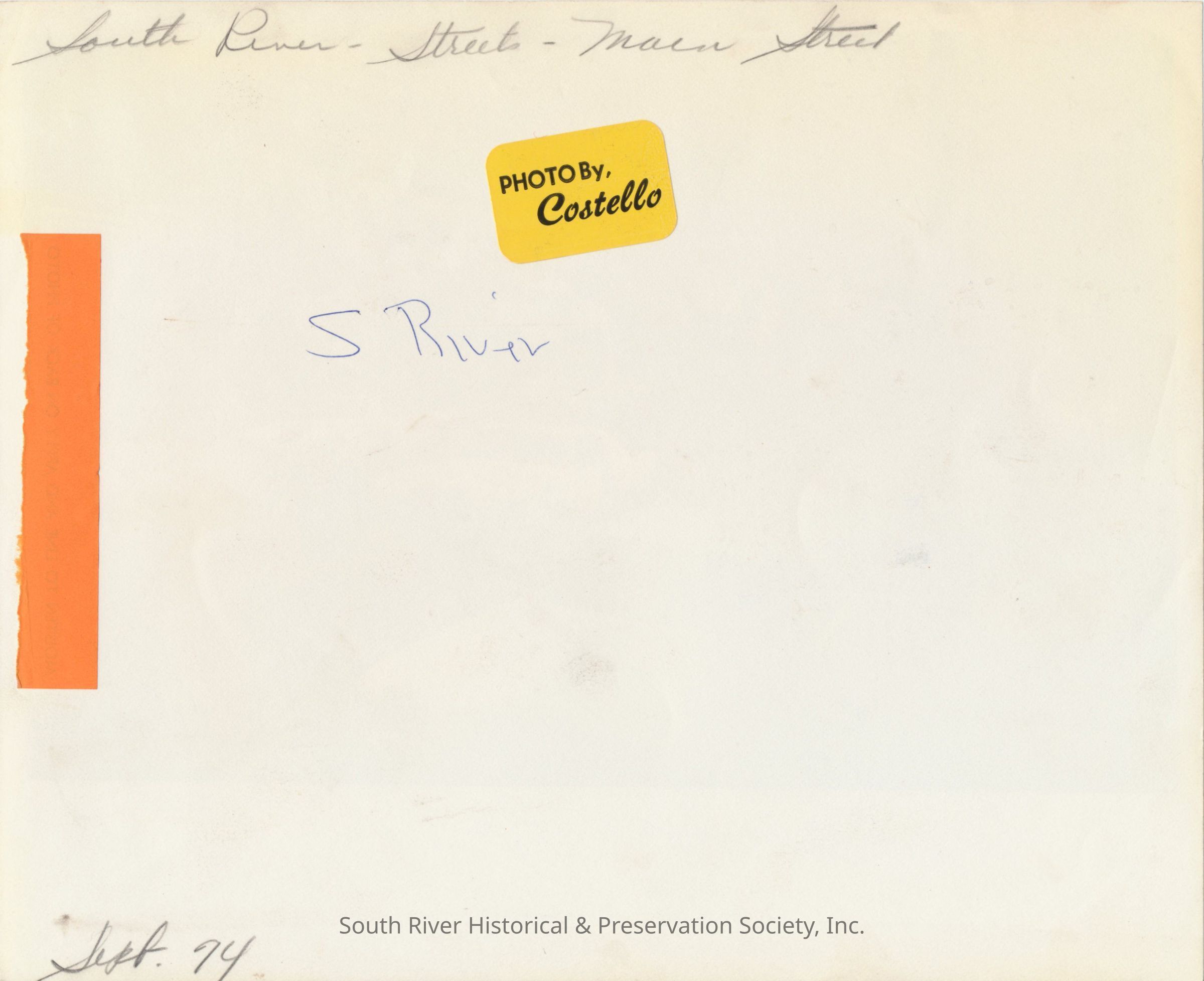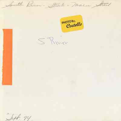 The back of the photograph has several handwritten notes: "South River - Streets - Main Street," "S River," and "Sept. 74." A yellow sticker identifies it as "Photo by Costello."