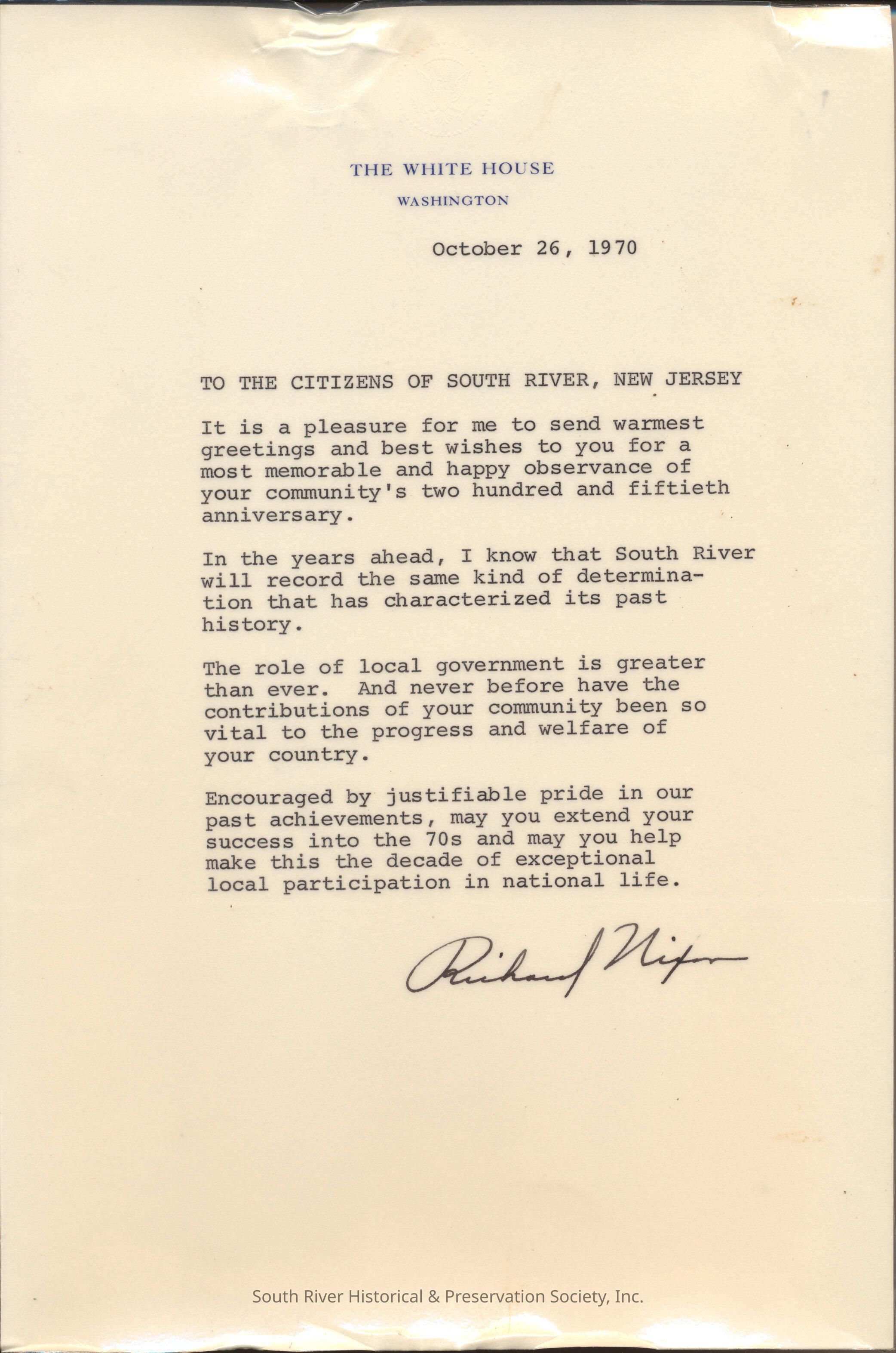 Presidential Letter to the Citizens of South RIver, New JerseyEntry/Object ID