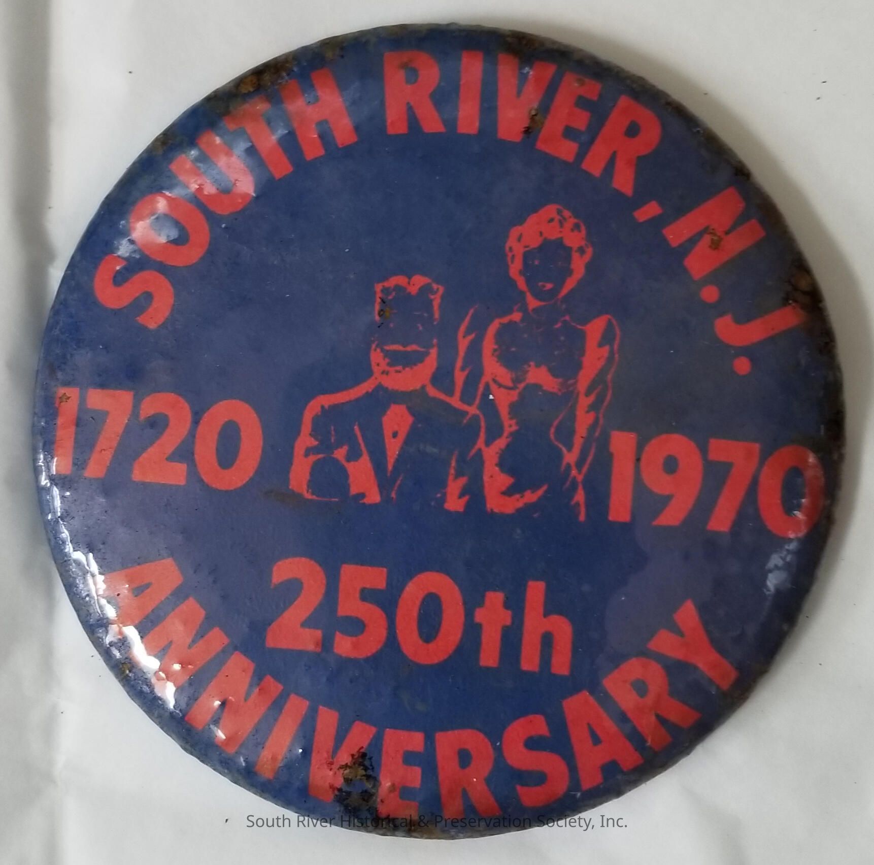 Metal and plastic button with a pin back. Button is blue with red printing that reads, "South River, N.J., 1720-1970, 250th Anniversary." The center of the design includes outlines of a man and a woman in historical dress.