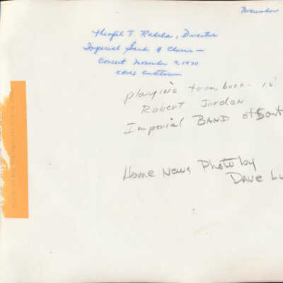 An additional note in pencil reads "Playing the trombone is Robert Jordan, Imperial Band of South River. Home News photo by Dave Lukowicz." The left edge has the remains of a sticker with mirror-imaged text reading " Moisten to line and apply on back of photo."