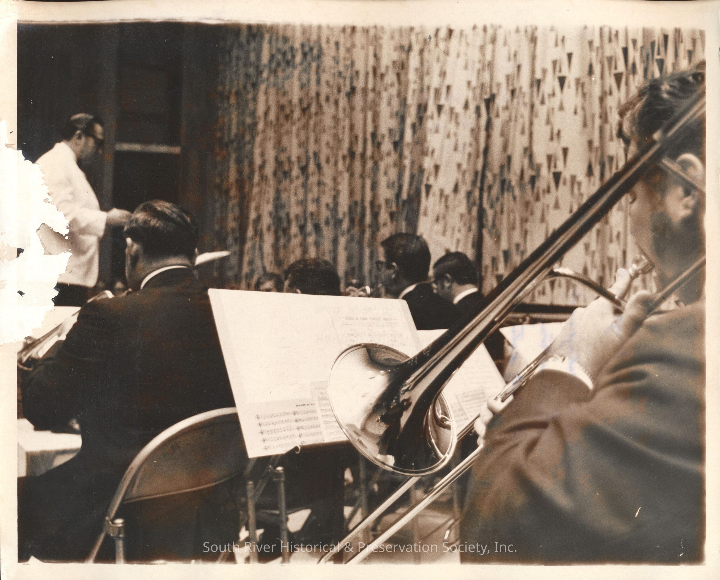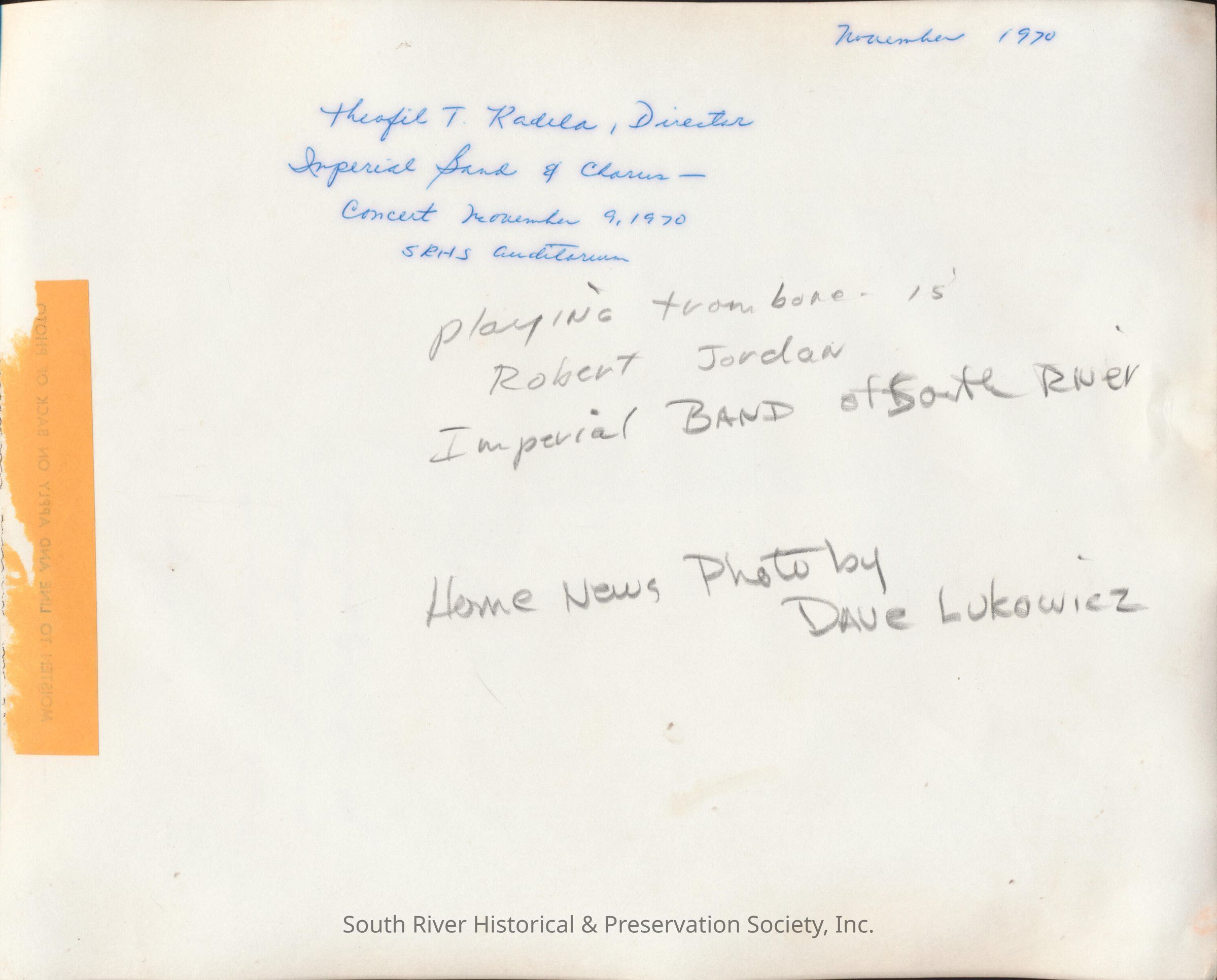 Photograph of a portion of the Imperial Band along with its director, Theofil T. Kadela, during a concert for the celebration of South River's 250th anniversary. The trombone player in the foreground is Robert Jordan. The event was held in the held in the South River High School Auditorium on November 9, 1970.