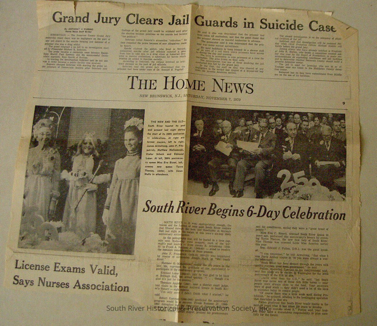 Page includes an article with two photographs from South River's 250th anniversary celebration. The photos are captioned "The new and the old." The photograph at the left shows Eva Bissett, who was crowned Queen Riverie in 1920, next to Taryn Thomas, the new queen. Dawn Matts, a member of the queen's court, is also in the photograph. The photograph at the right shows a group of former South River mayor's seated during the celebration program.