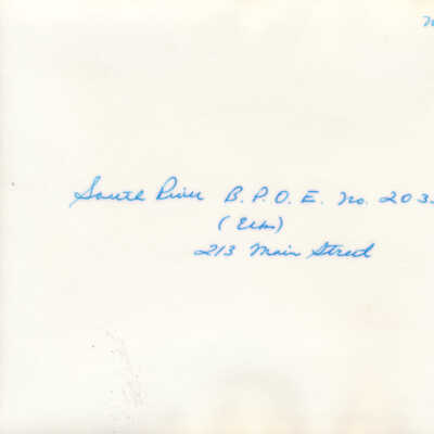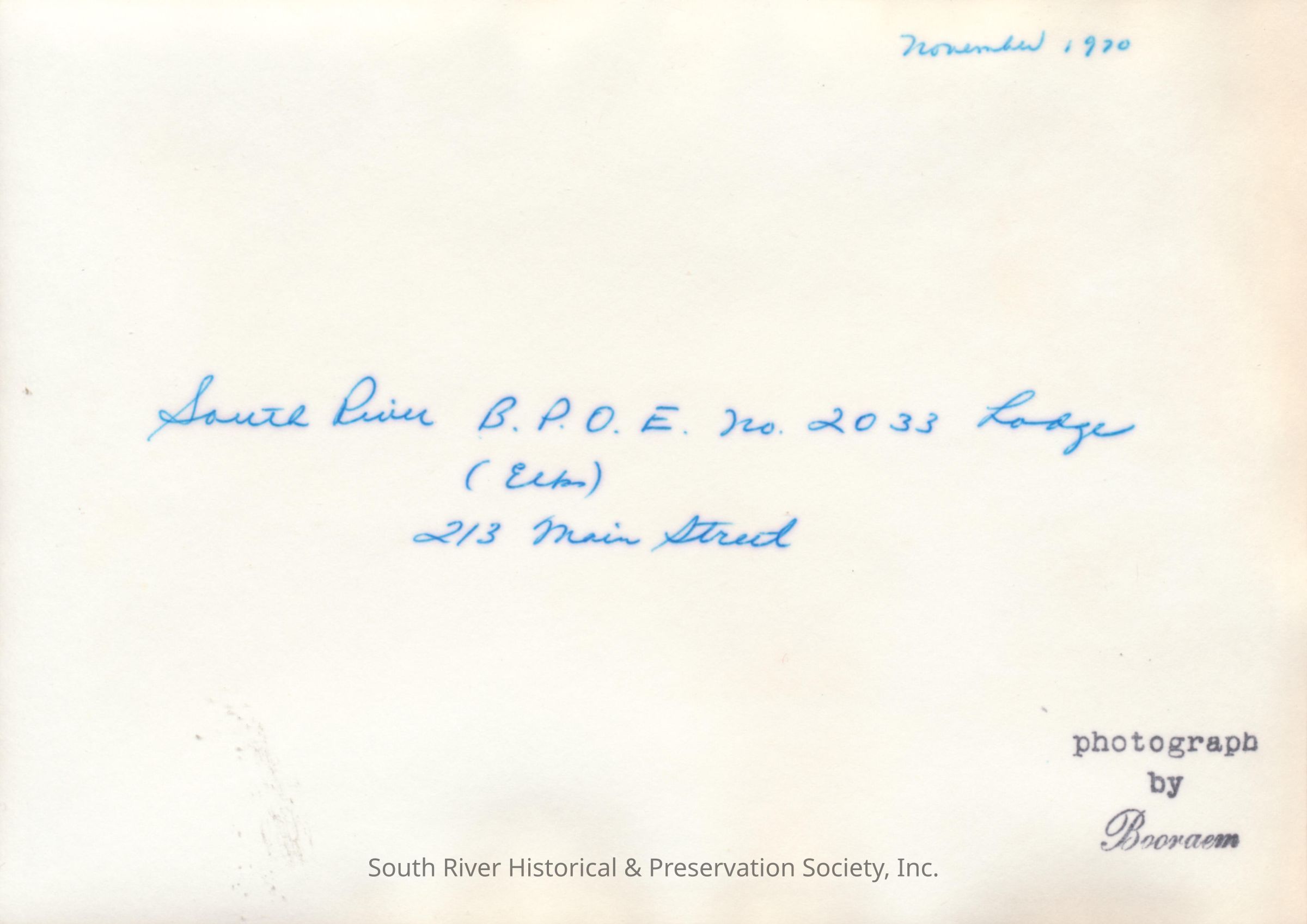 A note handwritten on the back in blue ink reads "November 1970; South River B.P.O.E. No. 2033 Lodge (Elks), 213 Main Street."