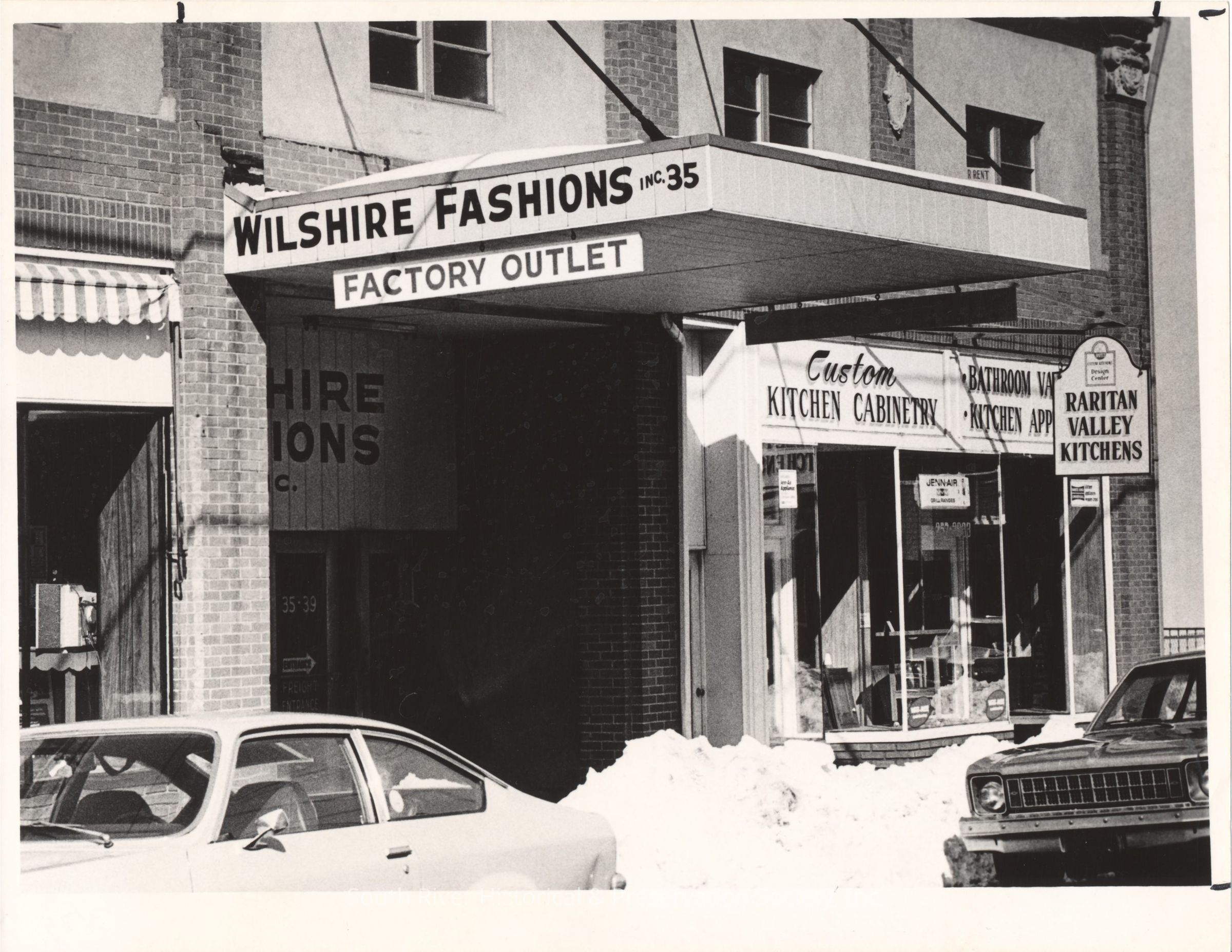 Black and white photograph of Wilshire Fashions, Inc. located on Main Street in the former Capitol Theatre building. A portion of the store to the left of the Wilshire Fashions entrance and Raritan Valley Kitchens, to the right, are also visible. There are cars parked along the curb and snow piled on the sidewalk.