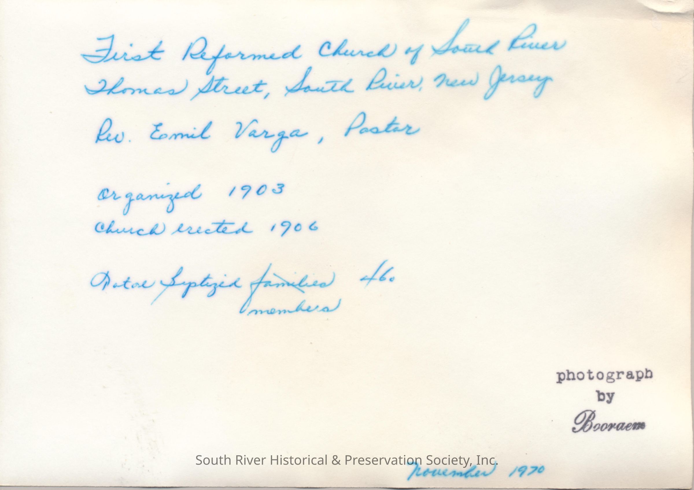 A note handwritten on the back in blue ink reads "First Reformed Church of South River, Thomas Street, South RIver, New Jersey; Rev. Emil Varga, Pastor; organized 1903; church erected 1906; Total Baptized members 460; November 1970." The word "members" is written below the word "families" which has been crossed out.