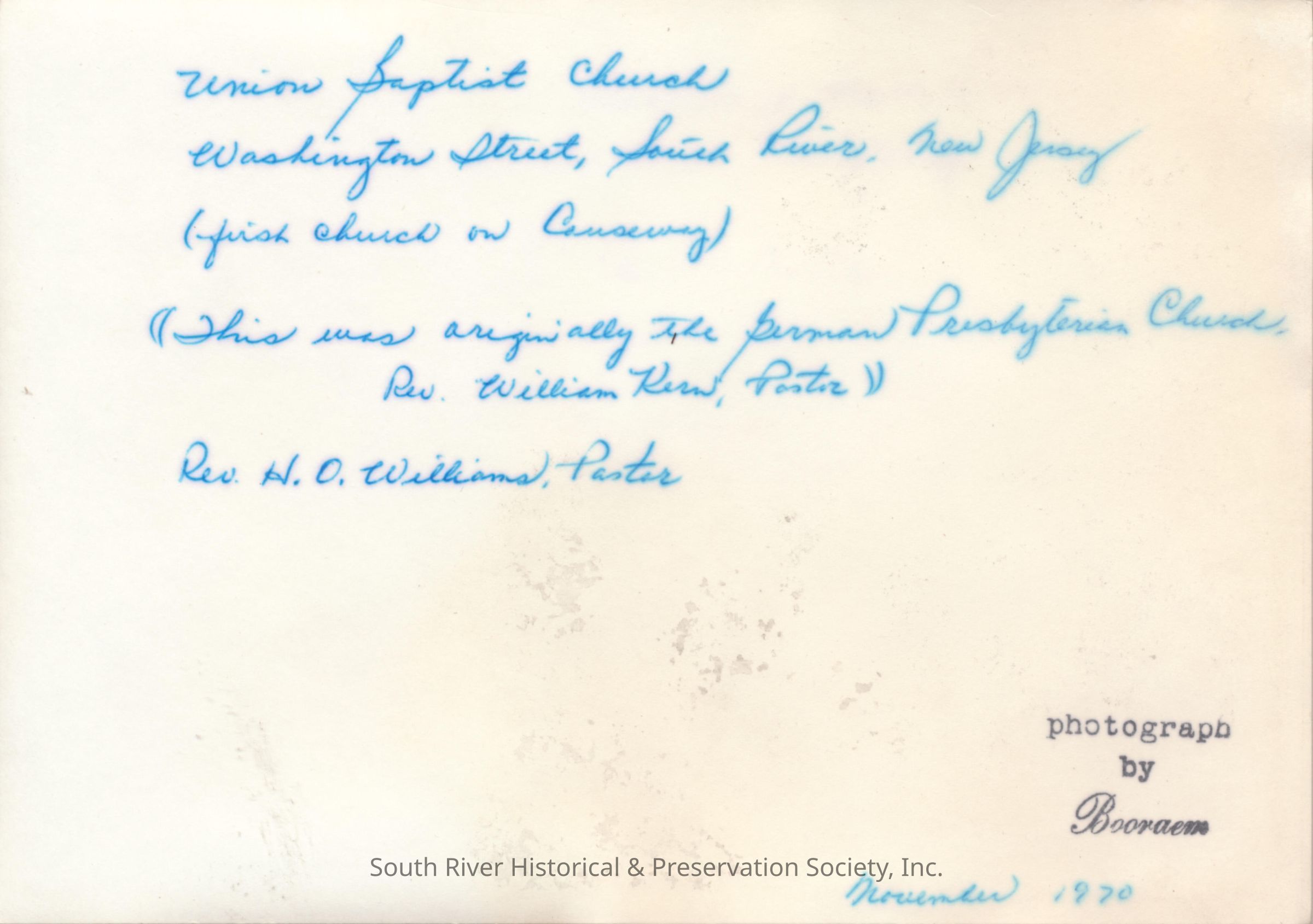 Union Baptist Church, Washington Street, South River, New Jersey (first church on Causeway); (This was originally the German Presbyterian Church, Rev. William Kern, Pastor; Rev. H. O. Williams, Pastor; November 1970.Lexicon